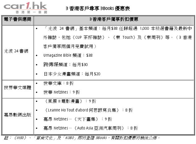 今日書展正式開幕,3 香港早前已搶先推出 3Books 服務。現有 3 用戶,可以月費 $38,睇光波 24 書網提供的雜誌和書籍內容。另外,3 香港也有與世界華文媒體合作,提供明報及萬華媒體等中文出版社的叢書和雜誌,例如 Hi-Tech 等。雜誌方面也有《東Touch》、《東周刊》、《CUP》等,惜有關內容都有限制,只是精華版而已,或許是他們擔心影響銷量吧?