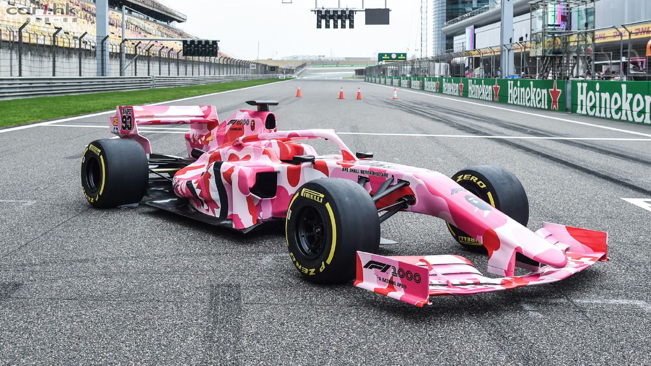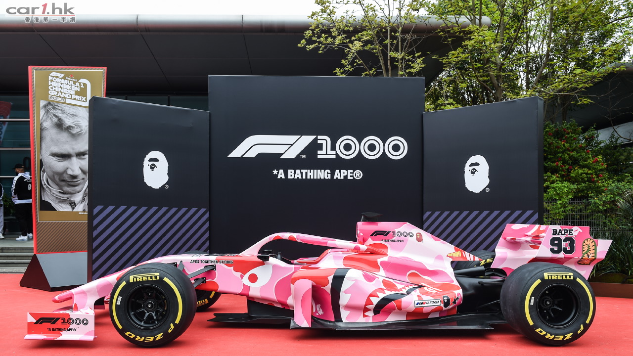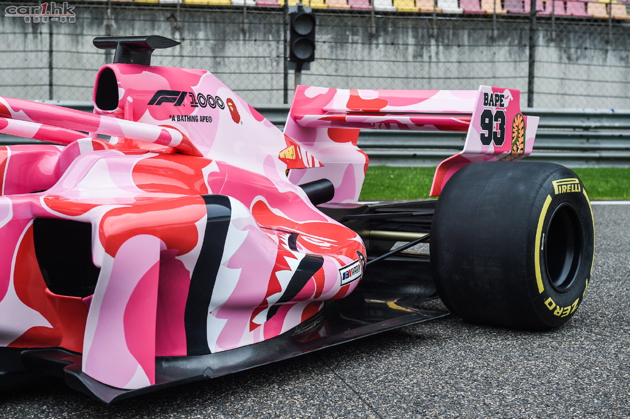 賽車以F1經典炫酷車型為設計原型,將BAPE 經典粉色ABC CAMO圖案覆蓋車身,印上競速賽車的象徵F1 紅色LOGO、「F1 1000」字樣、「APE HEAD」及代表BAPE 創立年份的數字「93」,搭配BAPE 矚目鯊魚圖案。高調空降上汽國際賽車場,再次締造跨界合作的經典!