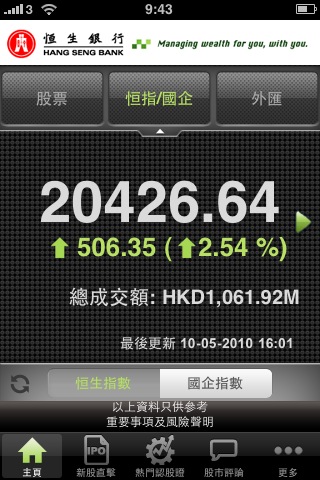 恒生銀行為 Apple iPhone 用家特設應用程式,以 iPhone 獨有的互動介面,提供一個多元化的投資資訊平台,立即免費下載,即可隨時隨地瀏覽各項市場訊,捉緊投資機會。服務包括: