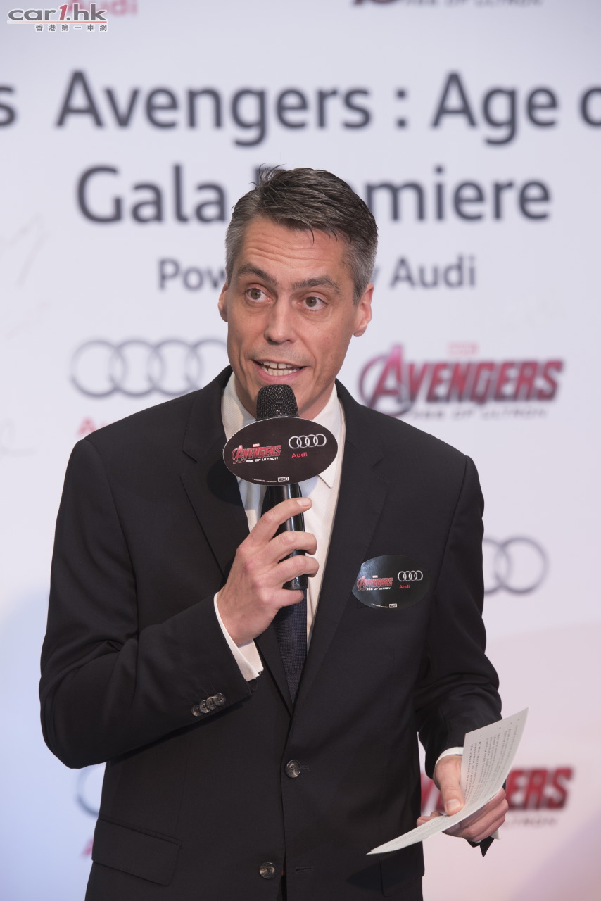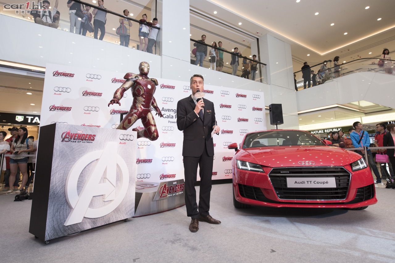 奧迪香港董事總經理康博睿先生(René Koneberg)表示:「奧迪香港榮幸全力贊助Marvel《復仇者聯盟2:奧創紀元》的香港首映禮。奧迪繼支持《鐵甲奇俠》電影系列後,非常高興於《復仇者聯盟2:奧創紀元》再次合作展示多款新車型。《復仇者聯盟2:奧創紀元》重點展現各路超級英雄本色及劃時代科技,正好對照奧迪以創新技術帶領汽車發展的品牌哲學。而電影內的超級英雄們致力化不可能為可能,更與奧迪的理念不謀而合。康博睿先生續說:「除了電影中展示的數款新車型,最近全新推出的Audi TT亦貫徹品牌的創新科技,糅合高性能、卓越環保表現及駕駛樂趣於一身。而同屬此車系的Audi TTS亦有於電影中展現鋒芒。Audi TT糅合了高性能、卓越環保表現及駕駛樂趣於一身,憑藉其運動氣息及由情感主導的設計令此款小跑車型成為一代經典,充分展現四環品牌的進取形象。」