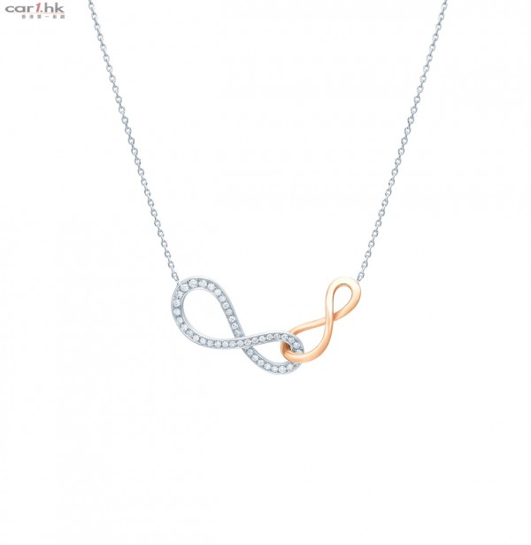 心雋系列18K白色黃金及玫瑰金鑽石項鏈及戒指設計獨特,由兩個無限的圖案連結一起,當中更鑲嵌喻意永恆的美鑽,好比兩雙手緊扣相牽,即使日子過了多久,兩雙手仍會繼續相牽。