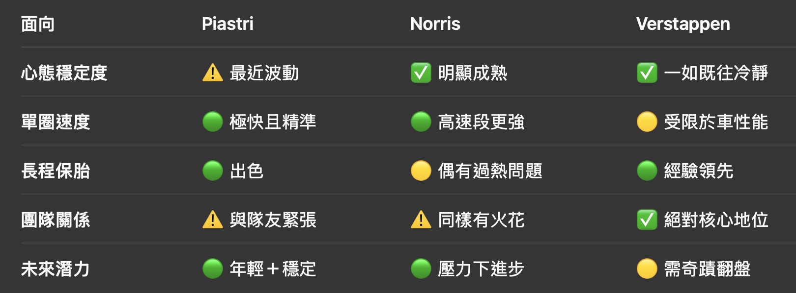 Norris —— 最具 momentum 的車手,有真實奪冠實力。