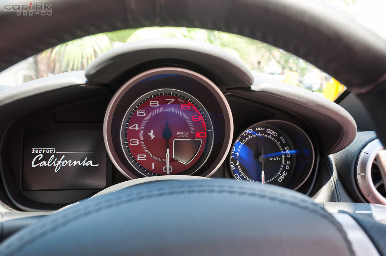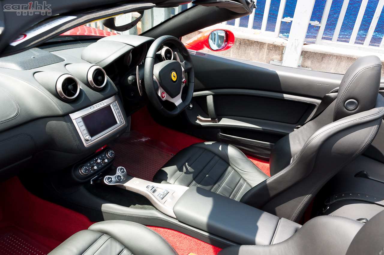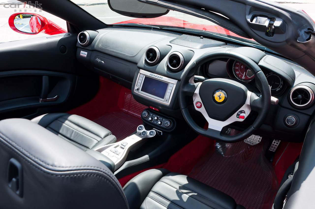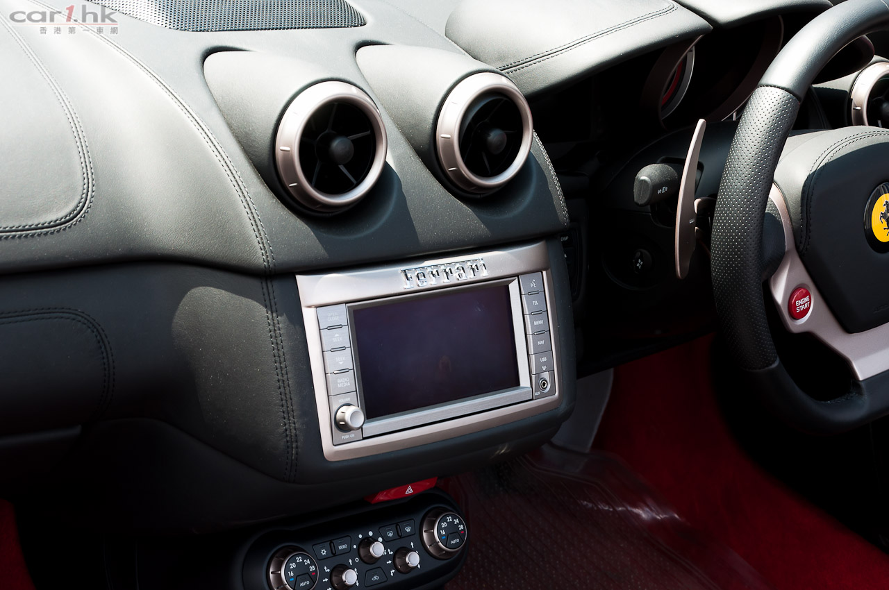 California 是 2+2 的座位設定,後座較適合小孩乘坐,但對於超跑來說這根本無傷大雅。California 的硬頂電動開篷是賣點之一,14 秒便能完成開關,天氣良好時想享受陽光樂趣,燈位停車等候時就可以搞掂。車內保持一貫 Ferrari 黑銀風格,大部份地方使用頂級真皮包裹和碳纖部件,加上 6.5 吋輕觸式彩色屏幕,內籠顯得豪華高貴。另外,雙圓儀表板的左方螢幕能夠顯各種行車資料,如行車里數、燃油存量和車門開關狀態等;還能透過頭車頭偵測裝置,感應與前方物件的距離,當太近時會有咇咇聲作出提示。