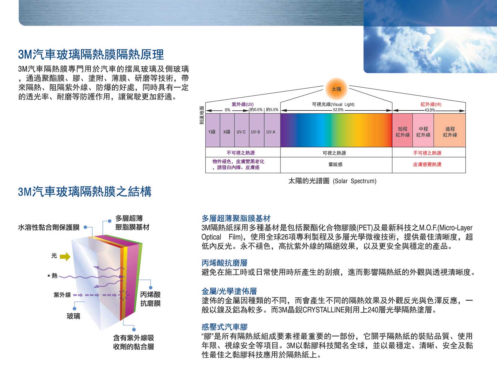 其實陽光包含了不同波長光線,分別 44% 可見光、53% 紅外線及 3% 紫外線,三者都會釋放熱能令到車子變熱,其中就以紅中線散發的熱力最強。3M 汽車玻璃隔熱膜就有多項專利技術得以有效阻擋以上 3 種光線,減少熱力進入車廂,在夏天能有效降低車內溫度,特別是現在的停車熄匙措施,不會一上車時就有種「焗桑拿」的感覺,冷氣也可開得更少,間接令到更慳油。