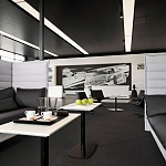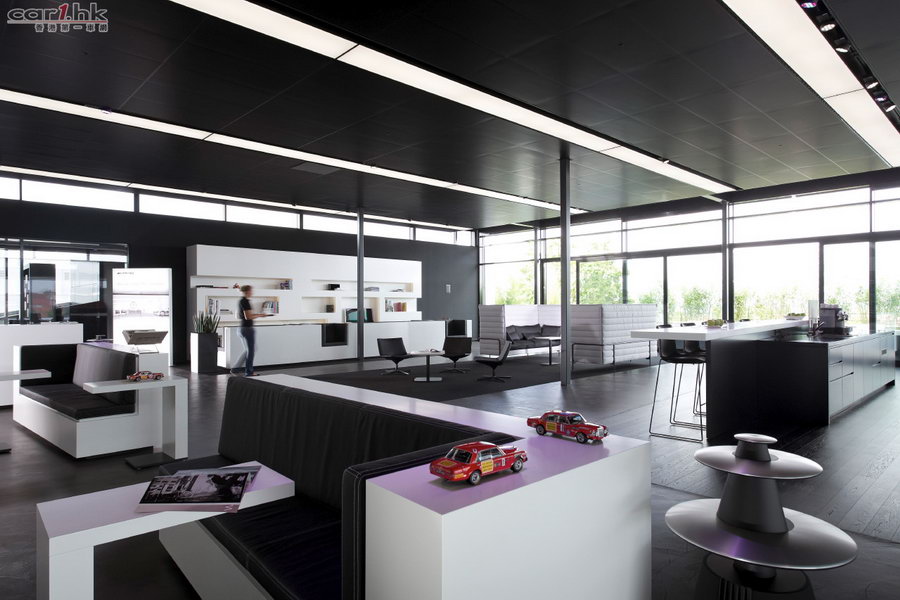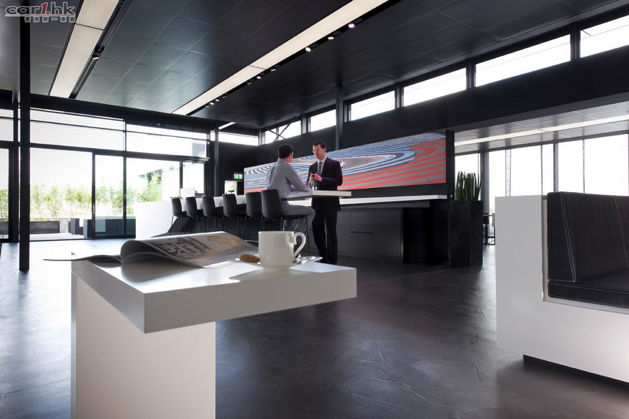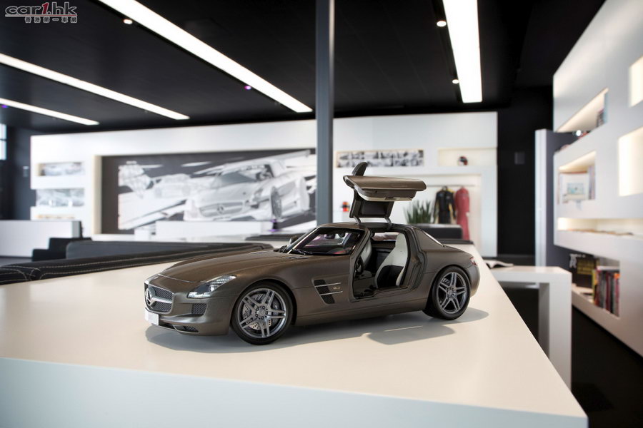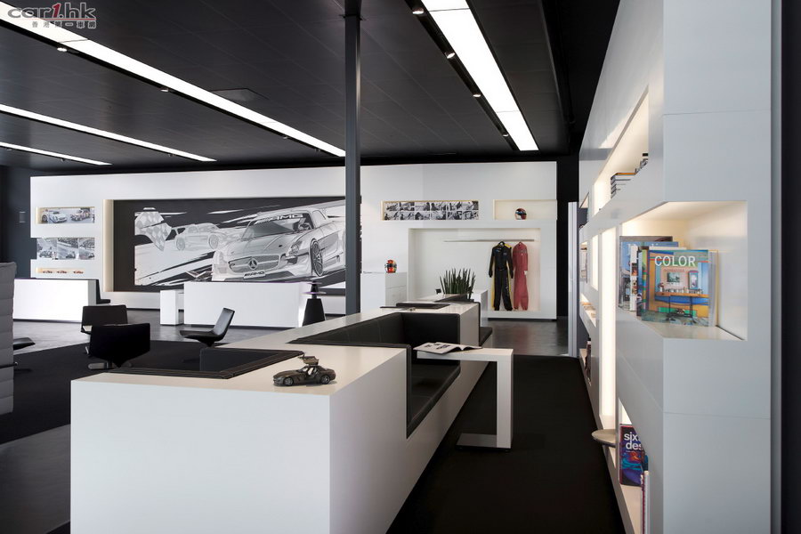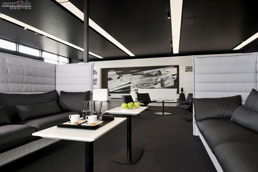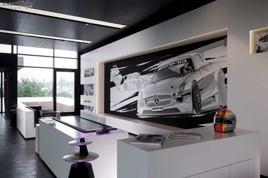 它的裝修設計以黑白兩色為主調,正門中央擺放了一部 300 SEL AMG 6.8L 經典改裝車之餘,亦備有多部 AMG 名作,當中少不了推出只有 1 年的「海鷗翼」SLS AMG GT3。另一區域則擺放了多部 iPad 及 PS3,提供獨一無二的娛樂體驗。如想享受寧靜一刻,訪客可以走到咖啡廳歇腳,甚至在餐廳用膳。各位會員有機會前往德國斯圖加特市旅遊或公幹,可以考慮到 AMG Private Lounge 參觀一下。