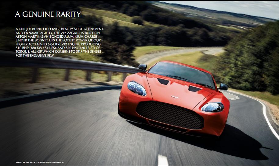 Aston Martin 以 V12 Vantaga 作為基礎打造的 V12 Zagato,將會在 3 月的日內瓦車展亮相。內籠方面採用頂級的真皮跑車座椅,並以紅色流體縫線突出車內的豪華格調;另外,還配備了倒車螢幕顯示器、GPS 系統和可選擇 1,000 瓦 Bang & Olufsen Beosound 音響系統。至於動力系統方面,以 V12 Vantaga 的 6.0 升 V12 自然吸氣引擎經過調後,可輸出最大馬力 510 匹及最大扭力 570 牛頓米。V12 Zagato 預計在日內瓦車展亮相後就會正式推山,目前所知將限量生產 150 部。
