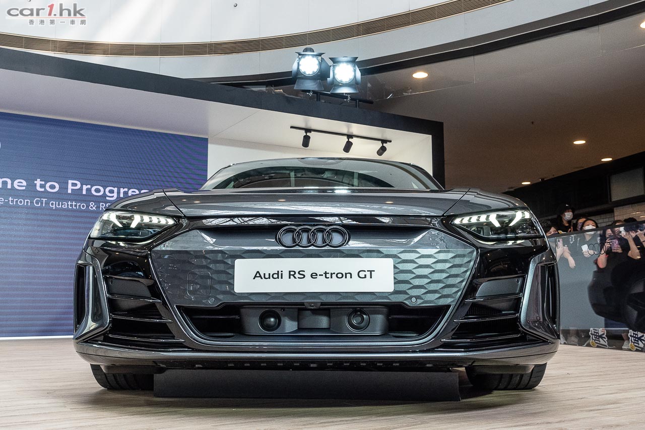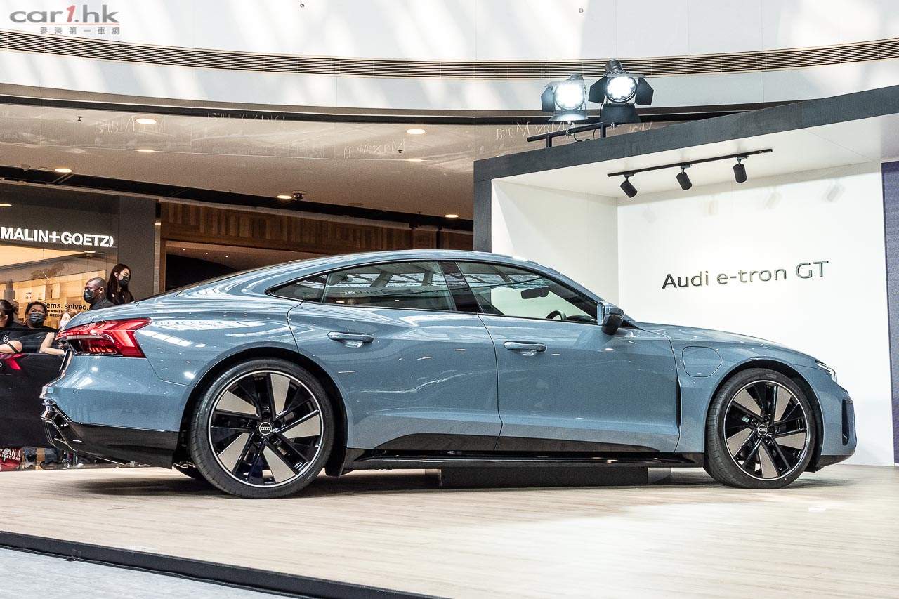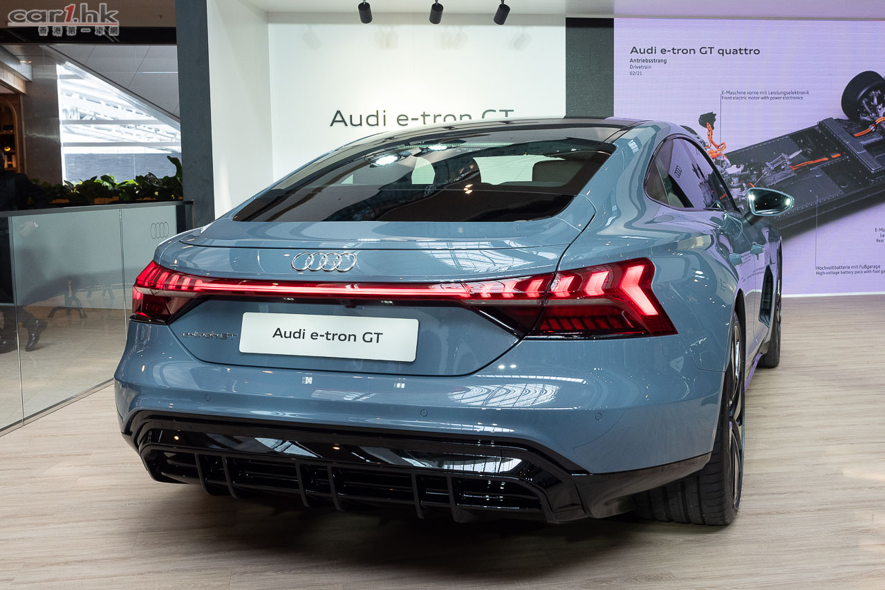 Audi 新車建基於專為電動車而設的底盤的 e-tron GT quattro ,車身長度與現有的 e-tron SUV 相若,亦即與 A7 Sportback 差不多大小;車子最大輸出有 350kw (Overboost時有390kw),電池容量 93.4kWh,續航力 488 至 452km,0-100km 加速需 4.1 秒,售價 $1,398,000 起。高性能的 RS e-tron GT 最大輸出有 440kw (Overboost時有474kw), 續航力 472 至 433km,0-100km 加速需 3.3 秒,售價 $1,998,000 起。