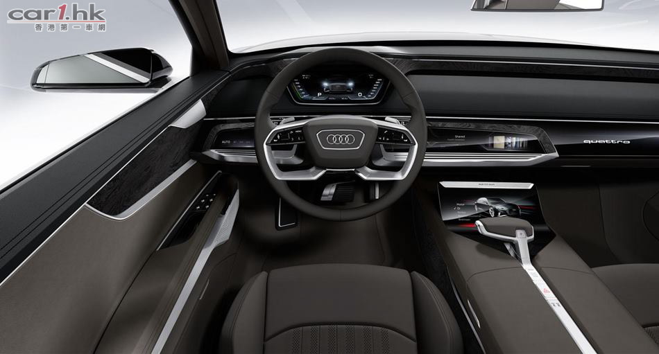 Prologue Avant Concept 以 2+2 的車廂佈局,每人都有獨立座位,空間感絕對充裕。動力系統就使用 3.0L V6 渦輪增壓引擎,同時備有 plug-in hybrid 插電式油電複合動力系統。最大馬力 353 匹和 100kW 的電動馬達配合,結合在一起後能達到 455 匹和 76.5kgm 扭力。8 速波箱和 Quattro 四驅系統當然少不了。其 0-100km/h 只需 5.1 秒,極速在 250km/h。這部車聲稱油耗為 62.5km/L,很驚人吧,二氧化碳排放量更僅有 43g/km(NEDC測試)。這部車將會在日內瓦車展中出現,最終真實車型又會進化成怎麼樣呢?才最令人關心和期待。