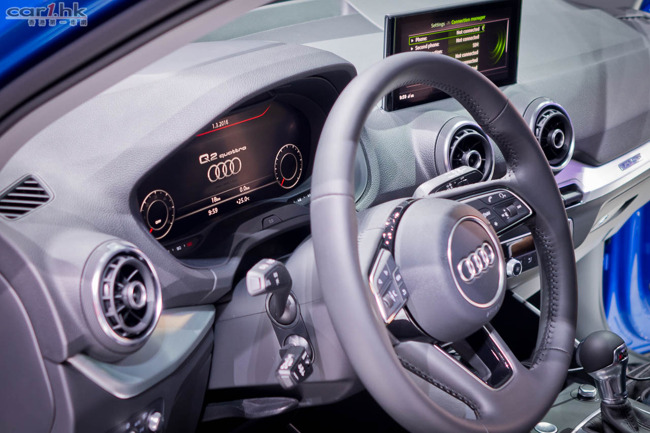 Q2 擁有不同的動力系統,包括 1.0L、1.4L、1.6L 柴油 TDI 引擎,配 6 速手動波箱傳動。頂級版有 2.0L TFSI 和 TDI 兩個版本,使用 7 速 S tronic 雙離合器波箱,同時可添加 quattro 四驅系統。大家不要看小它的越野能力,它設有電子懸掛系統,在 off-road 模式時可將底盤離地達 200mm,Sport 模式是比一般模式再低 10mm,可說是動靜佳宜。其實 Q2 跟其他揭背車體型已經有點相似,賣點真的它的電子懸掛,要頂級規格時價格也不會太便宜吧,如果只求外型的話,Q2 絕對殺食,很適合香港小家庭在人多車多而且路窄環境去駕駛,不過如果價格跟 Q3 相近的話,又會要消費者難以決定。