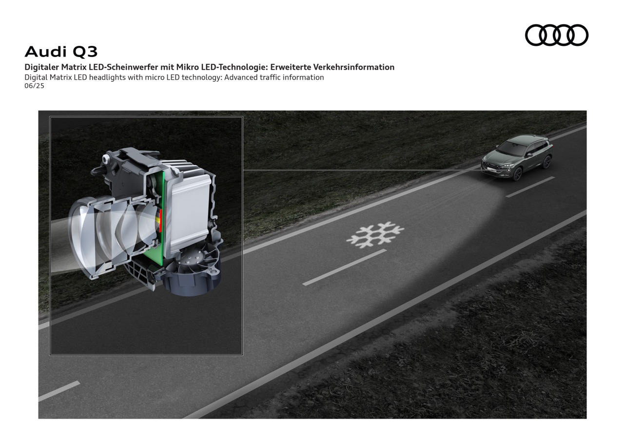 Audi 一向是汽車照明科技的領航者,而這次全新 Q3 搭載的 Digital Matrix LED 頭燈,再一次將「看得更遠、更準、更安全」的理念推向極致。這項技術首次引入小型SUV級別,將原本只屬旗艦級車系的光學科技下放,正式把智能燈光帶進日常生活。Audi 前照燈開發主管 Michael Kruppa 表示,良好的燈光不止是照亮前方,更是保護駕駛者與其他道路使用者的關鍵。尤其在秋冬季節、天色突暗或天氣惡劣時,「看清」與「被看見」只差幾秒,卻能避免意外發生。全新 Q3 的 Digital Matrix LED 頭燈 採用最新 micro-LED 微像素技術,每個模組內含 25,600 個獨立可控微型LED(僅40微米),就像一部光學投影機,能即時改變照明形態,並依據行駛環境智能調整光影。