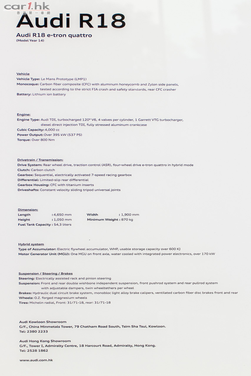 自1999年開始,Audi首次參與法國勒芒24小時耐力賽,一戰成名,讓全球車迷看到Audi的賽車技術如何在高性能及可靠性方面力壓群雄。Audi總共奪得13次勒芒24小時耐力賽冠軍,印證了Audi賽車技術配合創新科技的成就。Audi R18 e-tron quattro繼過去週末於奧迪海運大廈車展展出後,現移師到Audi九龍陳列室展出,各奧迪車迷將可一睹其風采。