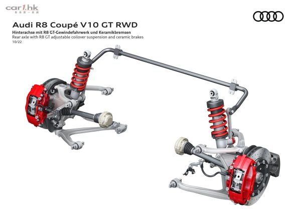 與 Audi R8 Coupé V10 RWD* 相比,新車的重量降低了約20 kg,總重只有1570 kg(不連駕駛者)。獨特的20 吋10幅式輪圈,搭配Michelin Sport Cup 2 高性能輪胎,專為道路及賽道共用而設,在重量減輕方面起著重要作用。輕量鍛造輪圈源自奧迪賽車,效能強勁的陶瓷制動系統是 R8 GT* 的標準配備,能省去額外的重量。此外,還有R8專用的桶形座椅和附有CFRP防傾桿的高性能懸掛系統。前防傾桿由碳纖維增強塑料製成,連同兩個可防止鏽蝕由紅色氧化鋁製成的連接桿連接件,減輕了重量的同時,更能增加路面抓地力及彎角動態能力。至於更具運動性的Audi R8 GT 避震懸掛套件屬於選配性裝置,套件可以給駕駛者單獨調整 R8 GT* 的離地距、懸掛壓縮和回彈級別。新車交付時,R8 GT* 客戶將會收到有關系統的操作說明及相應的工具。