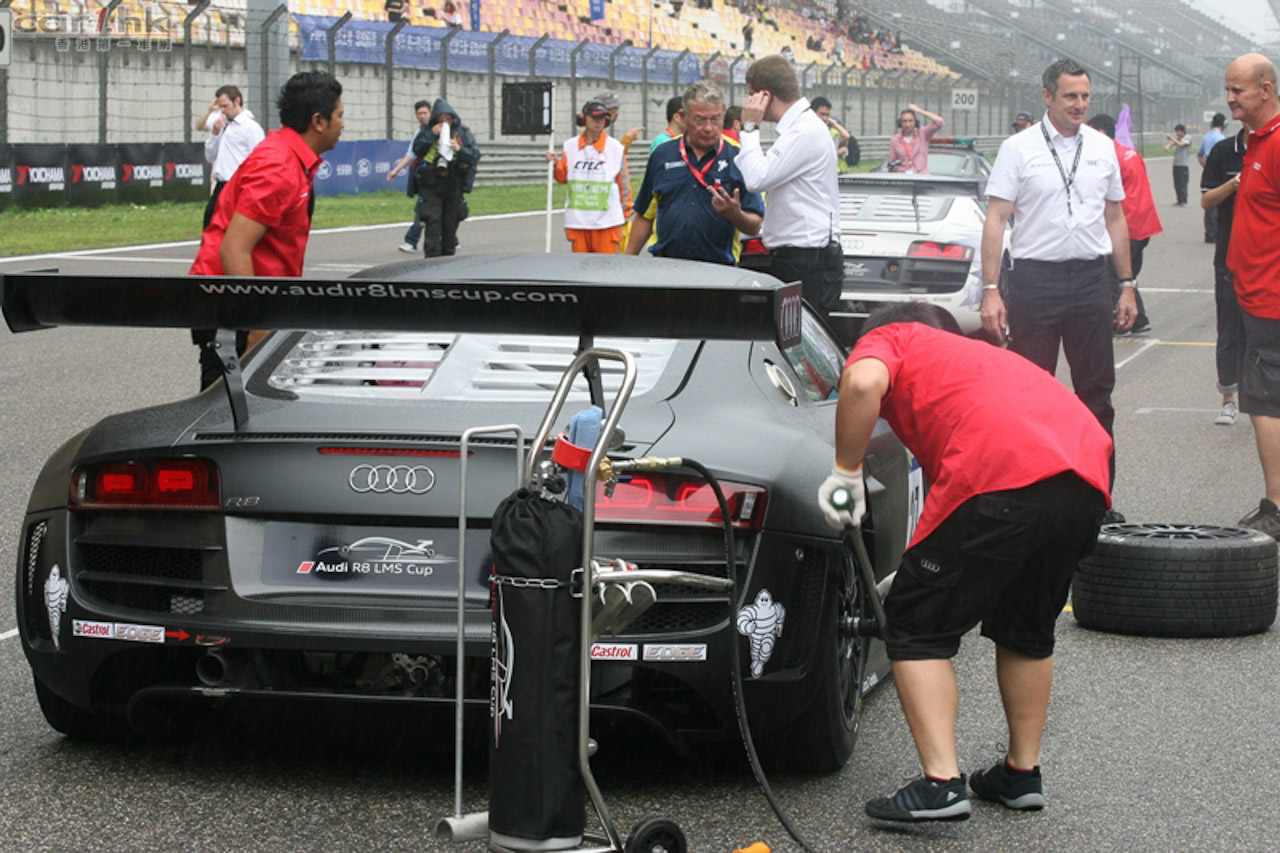 早上 10 點,第一回合比賽在突然飄起的小雨中開始,濕滑路面使得整場比賽險像環生並充滿懸念,1 6位奧迪 R8 LMS 杯車手在兩圈暖胎後正式發起對本賽季第一個冠軍獎杯的爭奪。來自馬來西亞的前 F1 車手熊龍(AlexYoong)很快適應雨天比賽和滾動式發車,在首圈第一個彎道便當仁不讓地超越了杆位發車的李英健(Marchy Lee),並在比賽中始終領先直至奪冠。幾家歡喜幾家愁,盡管專業的奧迪技師在賽前為奧迪 R8 LMS 換上雨胎,但駕駛 9 號賽車的百得利車隊車手王建偉在第一圈中發生事故遺憾退賽;駕駛 77 號奧迪 R8 LMS 的龐大奧迪車隊車手孫超和浙江奧通車隊小將朱胡安也在完成兩圈後退賽。