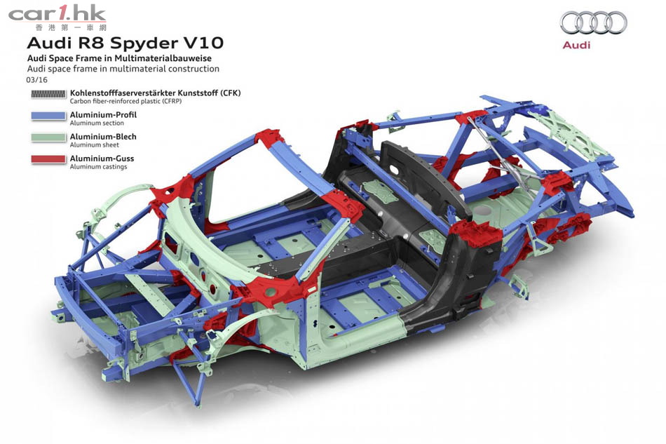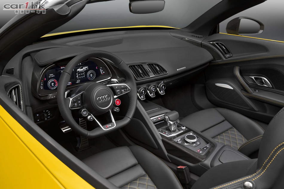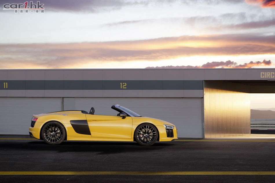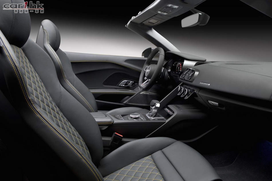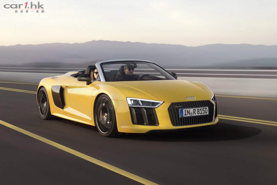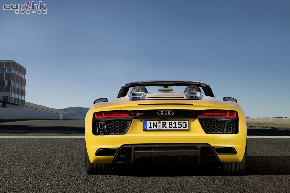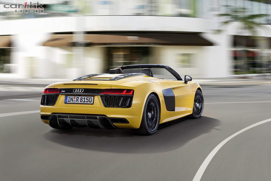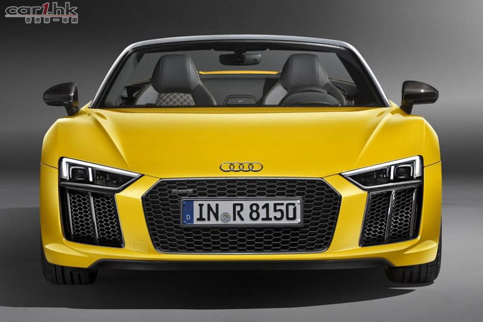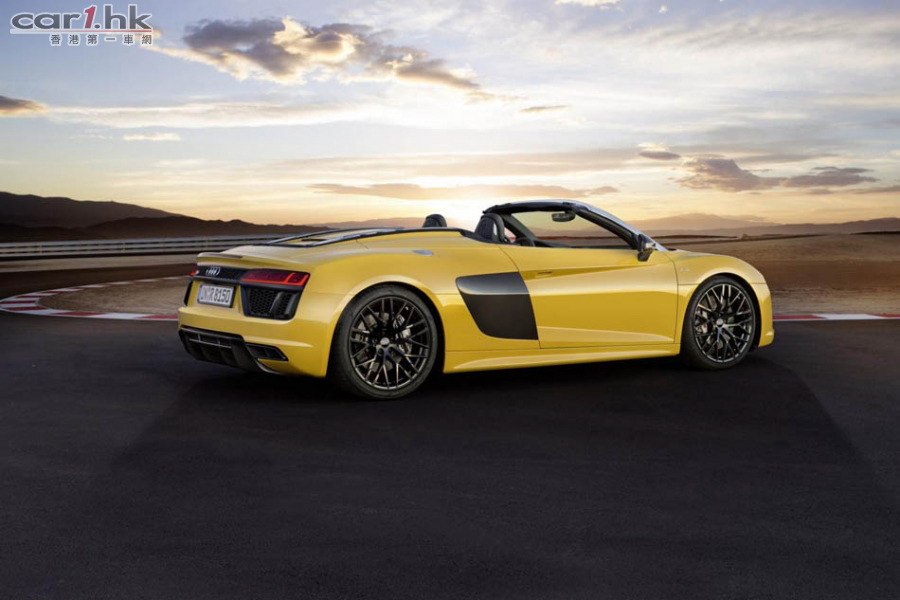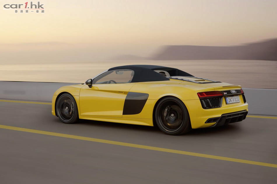 Audi 推出 R8 後,很快就發布開篷版 Spyder V10,新車車長短了 14mm、寬了 36mm、高度不變,為 4,426 X 1,244 X 2,650mm。變了開篷車後,R8 Spyder 的外觀神髓未有太大轉變。車頭車尾同樣使用最新頭燈,超大型家族式鬼面罩。新車電軟篷設計,整個車篷只重 44kg,開合只需 20 秒,只要在 50km/h 車速下仍然可以將車篷操作。新車還有隱藏化防滾設計,提升了這部車的安全性。引擎蓋、車篷結構與後窗框架都使用碳纖維材質來強化剛性與降低重量。開篷車的風阻一向較大,今次 Audi 工程師為 R8 Spyder 加入全新的纖維紡織迴風板,令低減小回捲入車內,借助車窗已可減少 90% 周邊氣流與 80% 肩部以上氣流逆流。