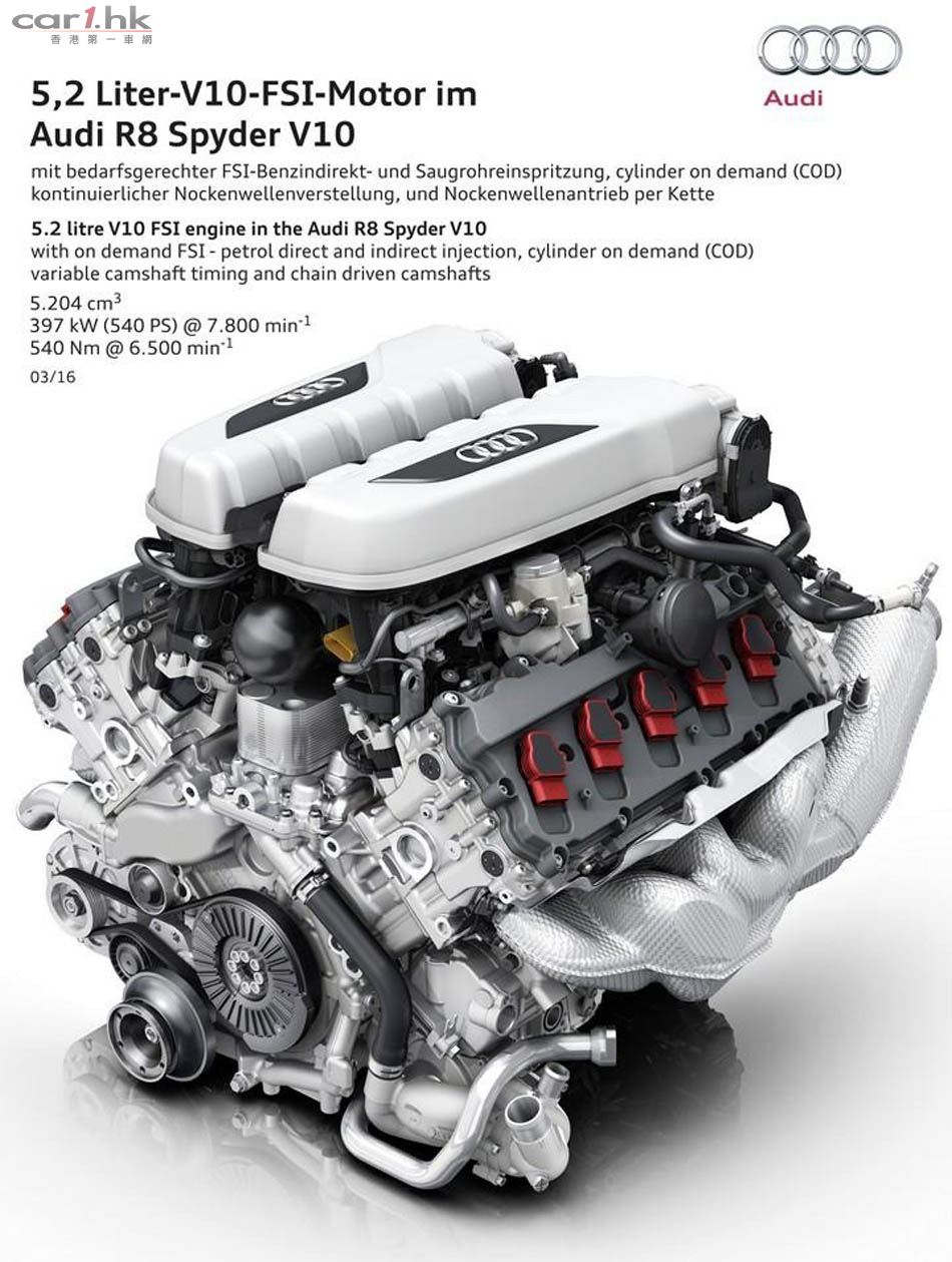 動力系統方面,R8 Spyder 使用 V10 5.2 公升引擎,最大馬力 540 匹和 540 牛頓米扭力,使用七速 S-tronic 雙離合器變速系統與 quattr o四輪驅動,0-100km/h 只需 3.6 秒。新車油耗比舊車低了 10%,只需 11.7L/100km。暫定今年夏天就會全球性推出。