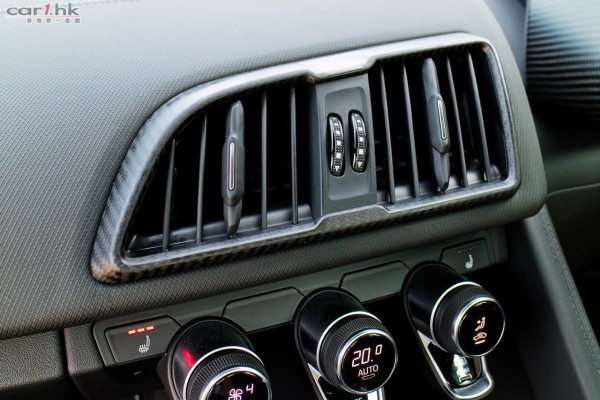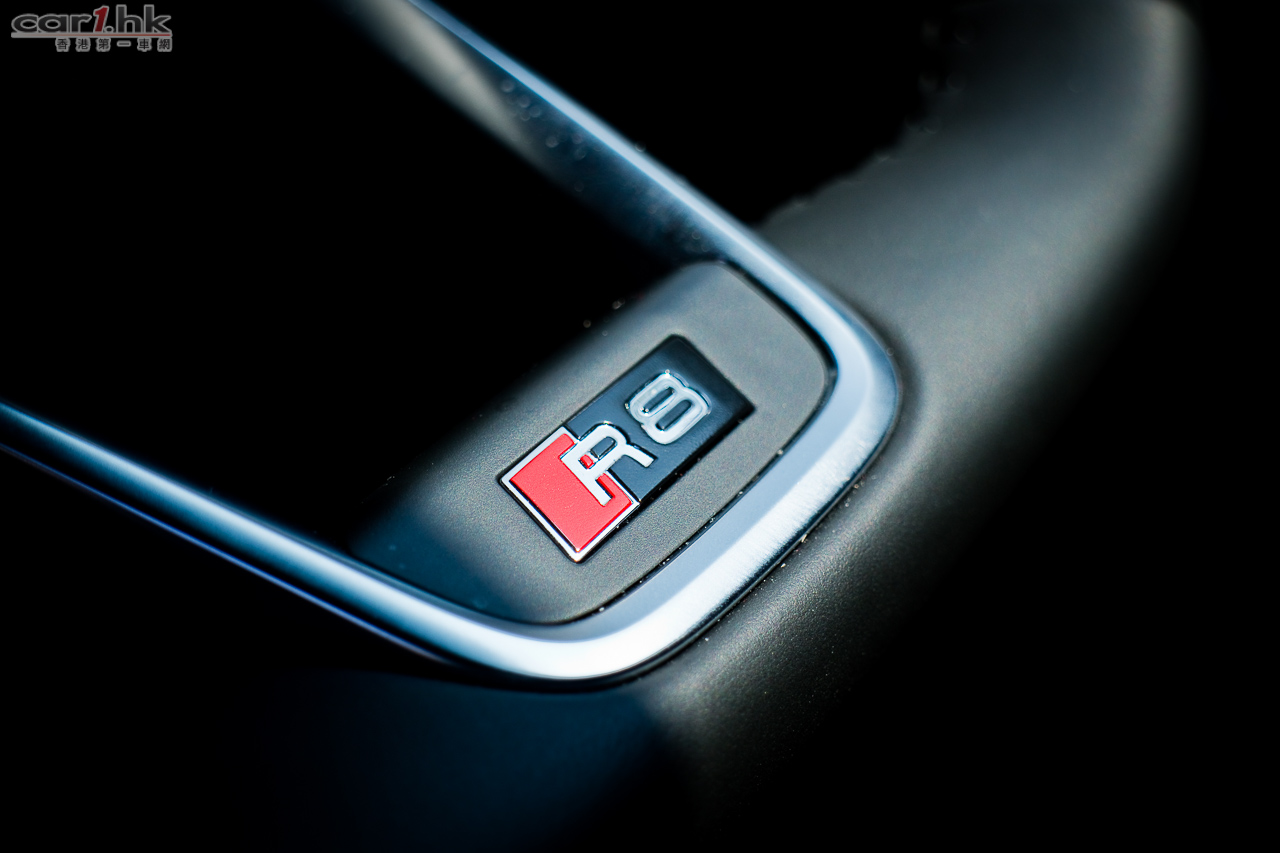 超級跑車的外觀主宰著它在路上的收視率,自從 Ironman 這套電影推出之後,其知名度大升,不熟悉車的人過往可能只知道它是 Audi 奧迪跑車,現在已經知道它叫做 R8。來到第二代,新車外型 MAN 得多,車燈起角的 LED 線條照明設計、六角型大型進氣口、明顯的引擎蓋和車身骨線、動態指揮燈(走馬燈)等等設計,都令新車更加滿足到男性車主。車身上的倒後鏡殼、尾翼、包圍上的擴散片都是實心亮面處理的 CFRP 碳纖製造,盡量減輕車身重量。這部頂級版使用輪圈為 20 吋,低一級版本預設為 19 吋。煞車碟以碳陶瓷製造,以提升它在激烈駕駛時的煞車穩定性。不過開了一整個下午,就算用香港最快的車速去開,一般都很難令這部車的煞車系統出現過熱問題,如果不帶它到賽車場的話,原裝配置已經OK。
