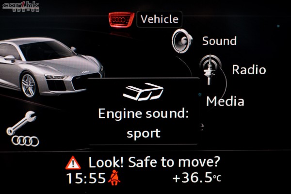 今代 R8 車身闊了、低了,但是在駕駛艙中感覺依然不錯,即使在香港不太闊的路面上仍然可以瀟灑走動。試駕車型為 R8 V10 Plus,與普通版本同樣是 5,204cc 引擎,不過普通版只有 540 匹 540 牛頓米扭力,V10 Plus 版擁有 610 匹和 560 牛頓米扭力,波箱為 7 速 DSG 雙離合器加 quattro 四輪驅動,兩部車要在香港的路面「揸盡」它的馬力潛能基本上是沒可能,不過在加速、駕駛感方面,香港道路上仍然能體驗到它的優越。在 Comfort 模式時,它仍然會有適量的呼吸聲排出,在需要快速切線、提速,Comfort 的反應一樣不錯。R8 V10 Plus 的 0-100km/h 加速只需 3.2 秒,如果路面唔夠暢通都幾難爆得盡。轉到 Dynamic 或賽車化全自訂模式後,即可聽到引擎排氣聲變得不一樣的低沉,即使只是輕輕進油未到引擎轉數中後時,其推動力已經十分猛,再進油推到紅區時,引擎聲、排氣聲已經達到極致嘈吵,轉檔後引擎轉數一跌再升,動力接得十分順暢,雖然有「chok 頸」情況出現,但仍是接受範圍之內,筆者相信如果將 R8 V10 帶到賽車場,其爆炸力可以更勁,我們的路面要進油玩 R8 去到三、四檔段已經超速了吧。另一個令人回味的是自然吸氣引擎在高轉時的聲浪實在太「正」。波箱轉檔方面,基本上是智能得十分嚴重,人快定電腦快,人可以快過電腦去轉波,不過是否最適合時機,可能不是,除非你是真車手;R8 V10 Plus 的轉檔是「快」,在 Performance 模式時轉檔反應只有 120ms,接著補油反應「更快」,連 Audi 方面的司機同事也強烈試多一點自動波的反應,當你想轉時電腦就已經幫你轉。