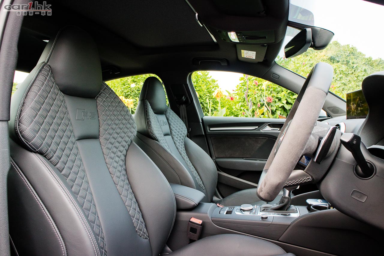 車廂佈局迎合了 RS 系列而進行優化,如高磨擦力的半桶車椅,椅背是格仔拉線設計,觀感令人討好。錶板、軚盤等位置都有 Audi RS 標誌的點綴,當然不少得平底跑車軚盤。中控台部份設計簡單易用,對於常常接觸 Audi 的筆者來說,上車就即時上手,回想起當年初試新款 Audi 中控台時,大概一個下午就已經可以習慣。RS 的轉檔撥片比較大型,手動轉檔時感覺會好一點,手指離遠一點也可以觸控到撥片,這個設計對 Sport Car 來說都頗為有用。