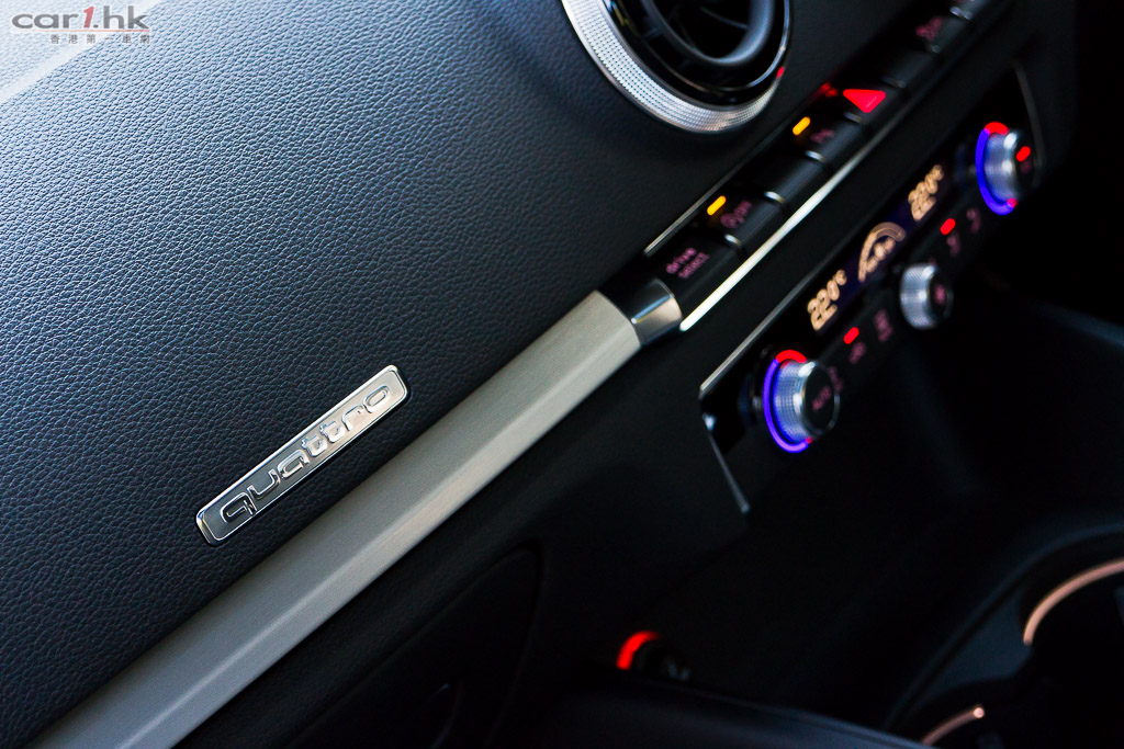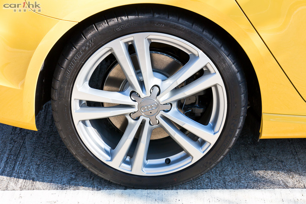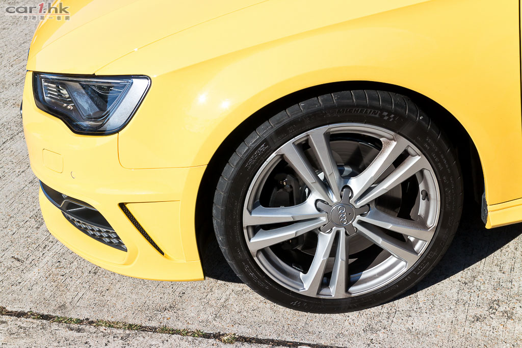 新一代 A3 的懸掛系統,前方的麥花臣支柱改配高剛性鋼製下搖臂、鋁質 pivot bearing 和鋁質副車架,後輪由鐵副車架承載新的四連杆懸掛,彈簧和吸震杆分開擺,分開縱向和橫向的負荷。S3 在這之下,有較硬和低 25mm 離地距的 sport suspension,和較硬的軸承。車子行駛感覺明顯比 A3 甚至新 Golf GTI 硬淨,車迷定會喜歡;另改用 18 吋雙平衡柱款輪圈,黑色制動卡鉗,前碟直徑 340mm。車子貼路性能很高,在 A3 和 Golf 要 cut 油鎖定的速度之上,S3 仍好扯上著加速去,而且比只會甩頭的它們更中性。車子有可變比率電動軚盤,慢速快軚,高速慢軚,反應直接得來有點四驅車的虛假感覺,quattro 向來如是。