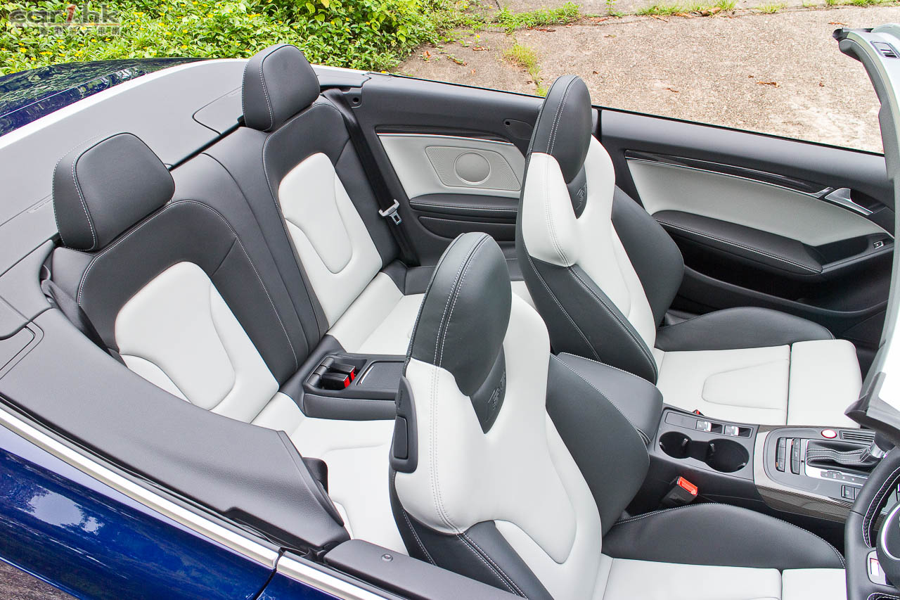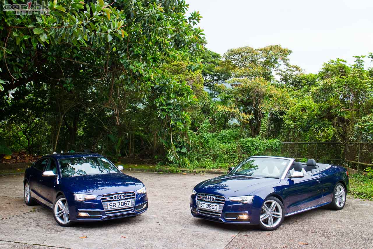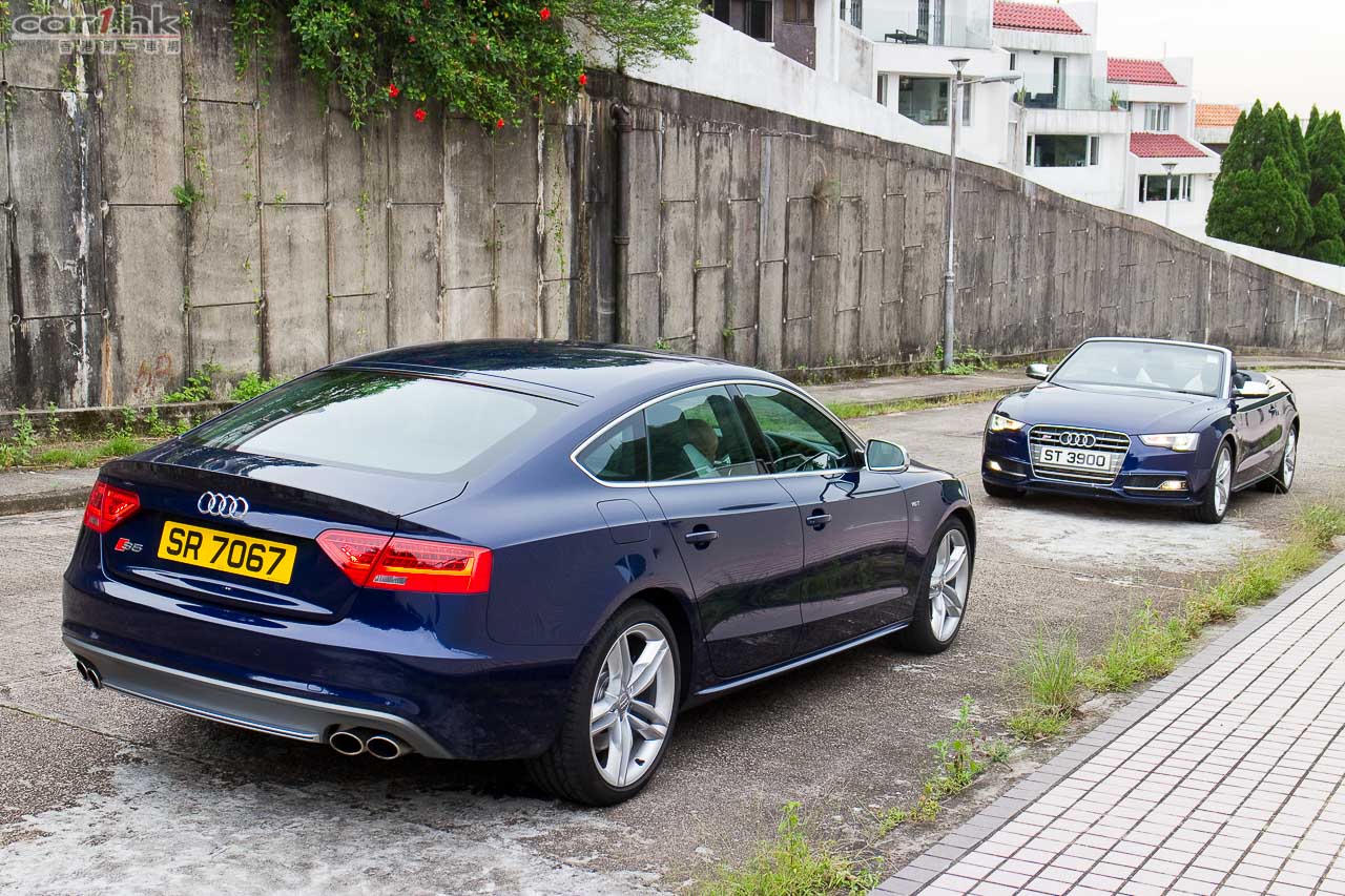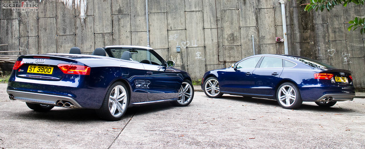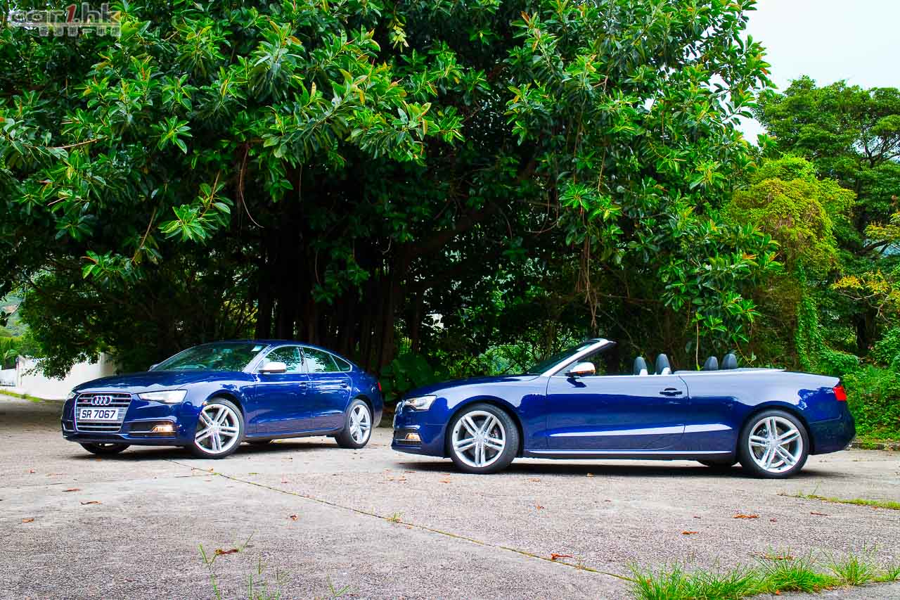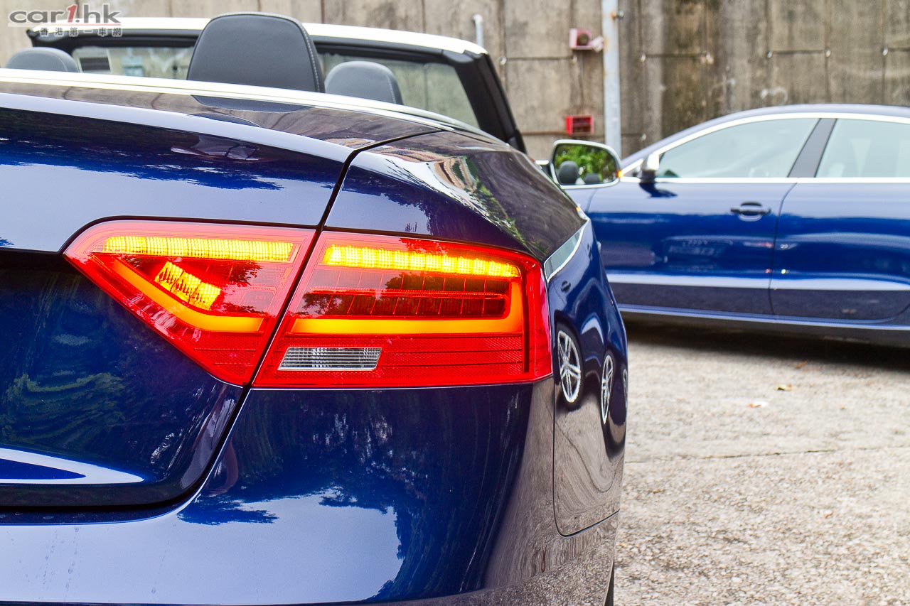 其實今次試駕兩部的 S5 Sportback & Cabriolet 都是應用同一心臟,外觀和設備也相近,一眼就看出它是 Audi S5 系列。S5 全車用上擾流包圍,車頭鬼面罩、軚盤、門檻金屬版都印有 S5 字樣,以突顯它的身份。今次 Audi 為 S 車系換上新的轉檔撥片,這兩部車也不例外,更大更有金屬感,使用起來比過往的就手得多。平底的軚盤也是預設設備,令到駕駛時減小頂腳的機會,換來更快速的軚盤操作。S5 配置了多個頂級設備,如 Xenon Plus 和日光 LED 頭燈、19 吋 5 幅式高透視輪圈、MMI 多媒體音響系統、3 區恆溫冷氣、藍牙聽歌手機免提系統、B & O 音響、S Sports 懸掛、雙出尾喉都是它們的裝備。而 Sportback 版還有天窗作賣點,開篷版在 50km/h 下可操作車篷的開關,開啟只需 15 秒,關閉是 17 秒。如果真是不幸運忽然下雨,它仍可以慢車將車篷關起來。