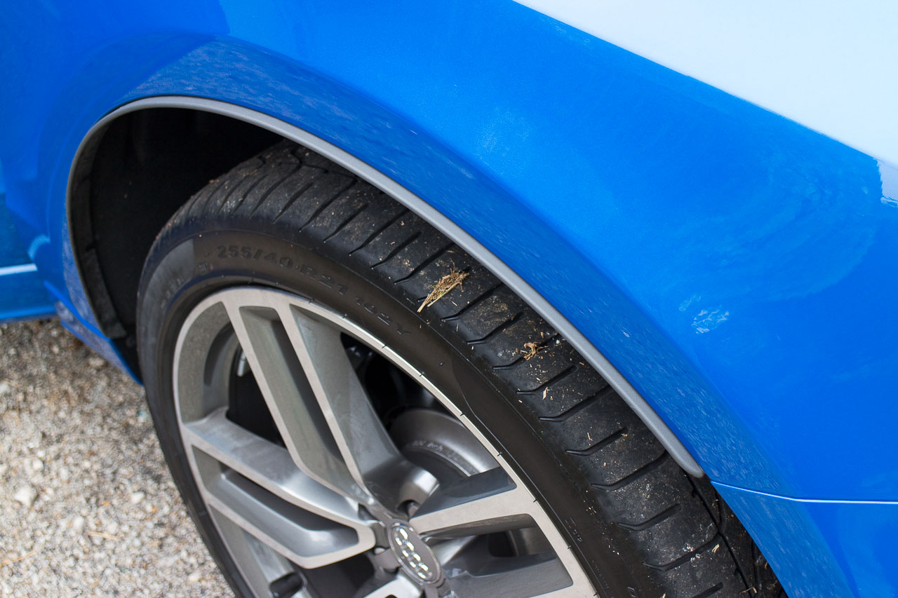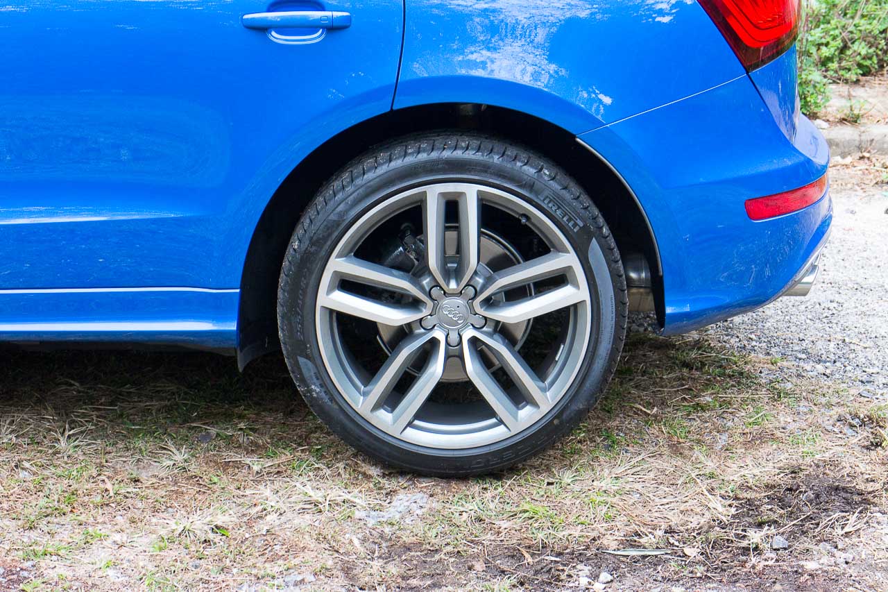 SQ5 原廠用 20 吋輪圈(用 255/55R20 輪胎),供拍攝的 demo 車換上屬 option 的 21 吋(用 255/40R21 輪胎);在 Q5 的鋁質前 5 連杆、後多連杆懸掛之下,SQ5 的 S Sports suspension 有低 30mm 的調校,較硬的彈簧和避震。