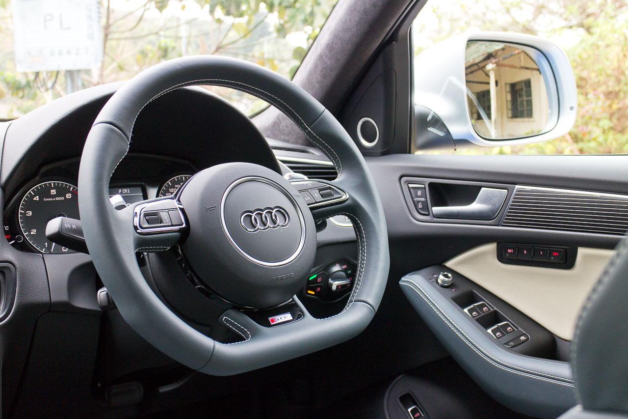 SQ5 外形上的「S 化」與 S3、6、7、8 類似,車子同樣改用稍為厚大的頭尾泵把, platinum grey 鉑金灰色鬼面罩底色,像雙層刀片鬚刨的銀色鬼面罩和下入風口和尾泵把橫間,有「SQ5」車章的啞黑色前制動卡鉗,四條排氣喉,凸出的車側裙腳,車頂尾翼,啞銀色門邊鏡殼,沙板上貼有「V6 T」;車子原裝改用20吋輪圈(用 255/55R20 輪胎),供拍攝的 demo 車換上屬 option 的 21 吋(用 255/40R21 輪胎),而見到的 Estoril Blue 藍色(以及另一黑色 Panther Black)則是 SQ5 專有的車身顏色。車廂內,有「S 化」後例必見到的 D 字形平底軚盤,圓形波棍頭,紅色撻火制,鋁腳踏,「SQ5」門檻牌,儀錶錶面改為灰色;SQ5原廠用 brushed aluminum 啞色鋁錶板和門邊飾塊,以及黑布天花作為裝飾,香港 則以原屬 option 的 Carbon Atlas 碳纖紋作標準裝備,demo 車則改用有鋁夾層的黑色 Beaufort 木紋飾板,以及 Moon Silver 灰色猄皮天花,非常特別;而藍/米色皮座則是 4 種可選的皮革顏色之其一。
