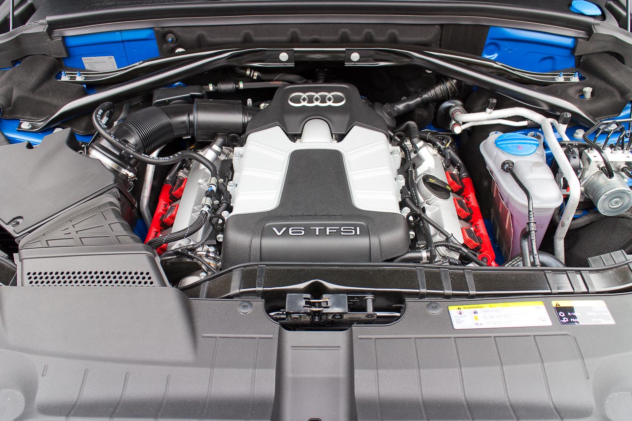 以上的 R 和 S 版 Audi,全部可在 5 秒內跑至 100km/h,車重 1,995kg 的 SQ5 是較慢的一部,不過也只需 5.4 秒,依然是一部認真地快的汽車,就如一群自由行趕著前往要去的地方般認真。Q5 車系中,斯文的正常型號有 225 匹的 2.0 TFSI和 272 匹的 3.0 TFSI,SQ5 其實也是 3.0 TFSI,即與 272 匹的 Q5 以及 310 匹的 A6、A7、A8 3.0 TFSI 採用同一基本設計的 2,995cc 90 度夾角 V6 機械增壓引擎,也亦即驅動 S5 Sportback 的同一台;supercharger 同樣設於throttle valve 油門閥下游,supercharger 有加快反應的短出氣管道,皮帶帶動凸輪軸,凸輪軸有可變正時控制,進氣 ports 有活瓣以提高不同轉數下的進氣效能,鋁曲軸底盤內設有平衡軸。此引擎為 S5 Sportback 效力時,有 333 匹和 440 牛頓米輸出;而 supercharger 轉數高達 20,000rpm,以及谷氣可達 0.8bar 的 SQ5 則有 354 匹和 470 牛頓米。
