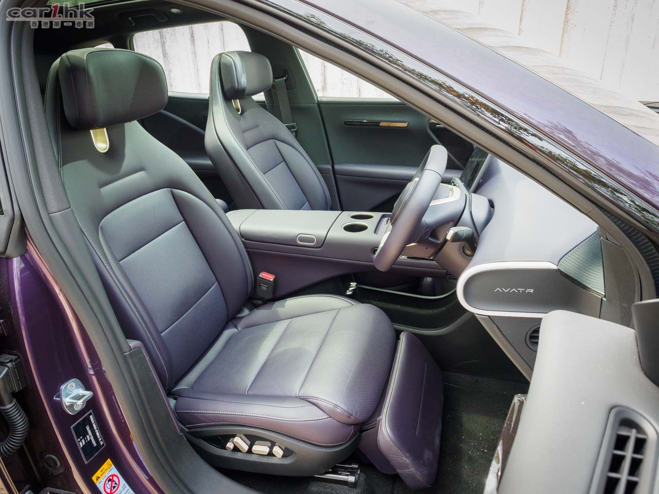 之前接觸過的 AVATR 11 有個波浪形的儀表台,你和乘客面前加中台各有屏幕。這部 07 的賣相更加科幻,雙層的儀表台在高處有一跨至乘客那邊的 35.4 吋顯示屏,連同需 $25,000 加購的電子門邊鏡的話,左右兩側再多兩塊顯示屏組成全闊畫面,加上中台和電子車廂倒後鏡,感覺科幻。氣氛燈在圍繞儀表台外框的「括弧」、門邊、椅背頸部孔位也有光條,鋪排得很有氣氛。軚盤像 Tesla 的 Yoke 軚般是長方形的;門板有高級的疏孔設計;儀表台接連門邊的地方像橋墩般,內側有「AVATR」Logo,整個車廂的設計感頗高。在享受配置上,四驅版配英國 Meridian 音響,有 25 個喇叭、2,016W 輸出、7.1.4 聲場,駕駛席頭枕設有喇叭。Nappa 皮革座椅有 10 層夾層來分擔體重,「零重力」前排可按掣連小腿墊攤長至「看牙醫」姿態,另有加熱、通風和 8 點按摩功能。後排設有兩段角度調節及加熱功能,中央扶手有多功能觸控控制屏。全景天幕設有電動太陽簾。空調系統有 PM2.5 活性碳濾芯,Ultra 版在中橋下層有插入式的香氛系統。前行李箱容量 64 升。車子標榜擁有同級最厚的 6mm 雙層隔音玻璃,車架內藏多處吸音棉並經 133 項隔音處理,達到劇院級寧靜程度。
