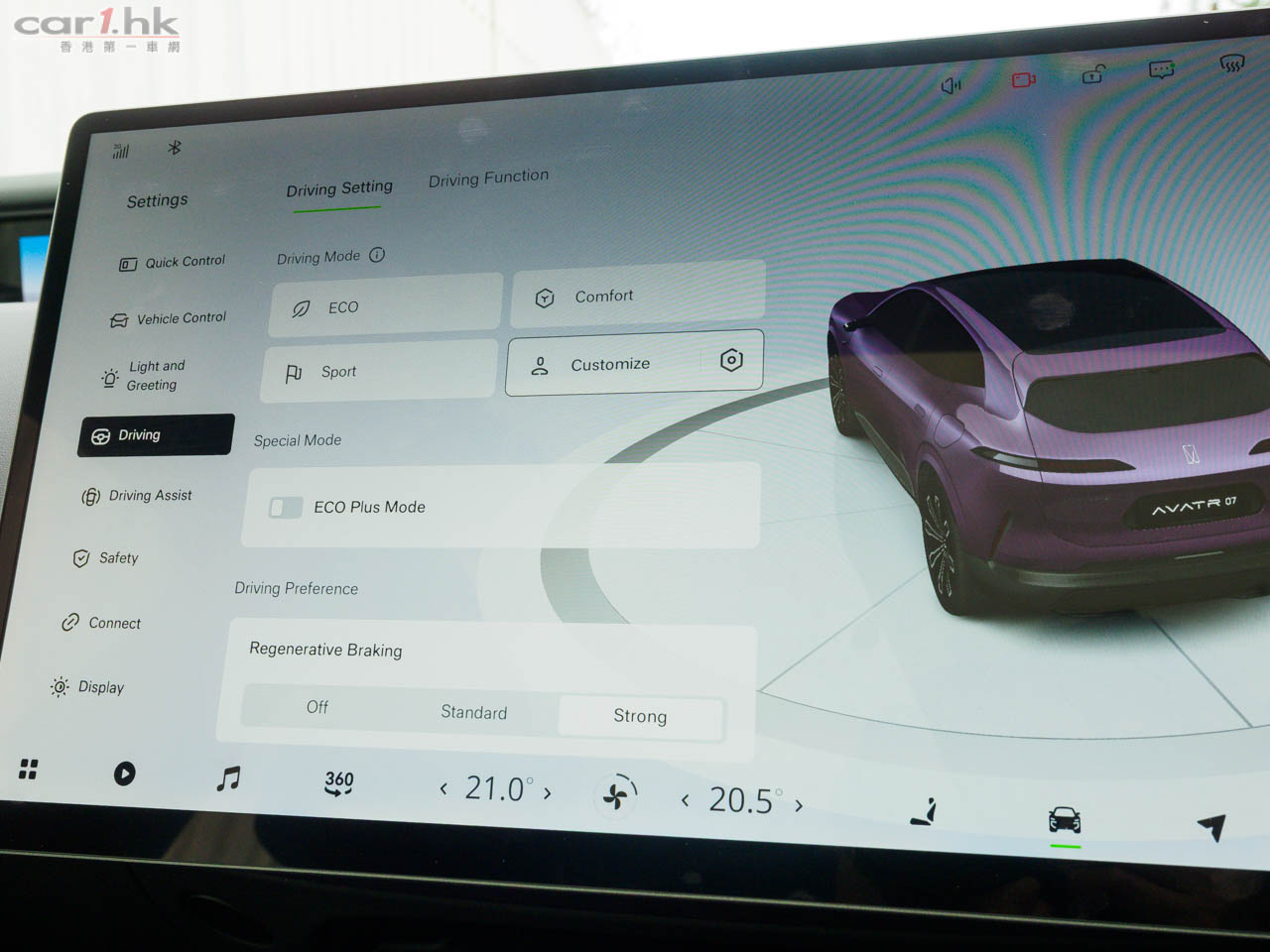 兩款 07 中,後驅版有 252kW (約 338 匹)/365 牛頓米輸出,0-100km/h 需 6.8 秒;測試的一部四驅 Ultra,雙馬達有 440kW (約 590 匹)/645 牛頓米輸出,0-100km/h 加速只需 3.9 秒,一踩便有強大的貼背感。Drive Mode 有 Eco、Comfort、Sport 模式,另有更慳電的 Eco Plus。Custom 模式可以自訂三種動力反應、兩段(及關閉)動能回收強度、三種軚盤感和兩種煞車踏板重量、三種懸掛軟硬、三段(及自動)車身高度。前雙搖臂、後五連桿加氣壓彈簧和電子避震的組合帶來優質的乘坐感受,2,420 kg 的體重在行車時仍有些微沉重感,各個 Drive Mode 和懸掛軟硬分別明顯。操作上,大屏幕的控制模式離不開調校後視鏡、調校軚盤,需從屏幕選好後再用軚盤按鍵調整,開關燈也要操作屏幕。駕駛時若要更改動能回收強度,手需伸向屏幕更改。長方形軚盤在停定時看來美觀,但扭動超過 90 度時會比較「交义手」(蹺手)。電子門邊鏡與 Lotus Eletre 遇到的一樣,慣性「烏」前看盲點時,屏幕顯示角度不變,無法像傳統鏡子般「偷看」更多角度,某程度上比鏡子危險。需透過屏幕調校的出風口角度較難精準掌握。那條長長的顯示屏將胎壓、耗電量、室外溫度等應在司機面前的訊息,分撥到乘客面前,司機位較難看清左方細節。隱藏在 Driving Functions 裡的特別功能中,Easy Load 在開啟尾門時車尾會自動降低,Intelligent U-turn Assist 則在司機大角度轉向時,系統會自動切換驅動模式並運用感應器輔助調頭。在貌似飛碟的外形和科幻舒適的車廂裡,AVATR 07 讓你在凡間享受雙馬達大力電動車的強加速感、「魔毯」懸掛的舒適,以及一般大路電動車常見的屏幕操作邏輯。