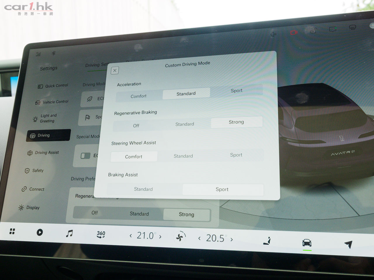 Custom 模式可以自訂三種踩電反應、兩段加 Off 拖慢回充度、三種方向盤和兩種 Brake 踏板感、三種懸掛軟硬、三段加 Adaptive 車身高度。