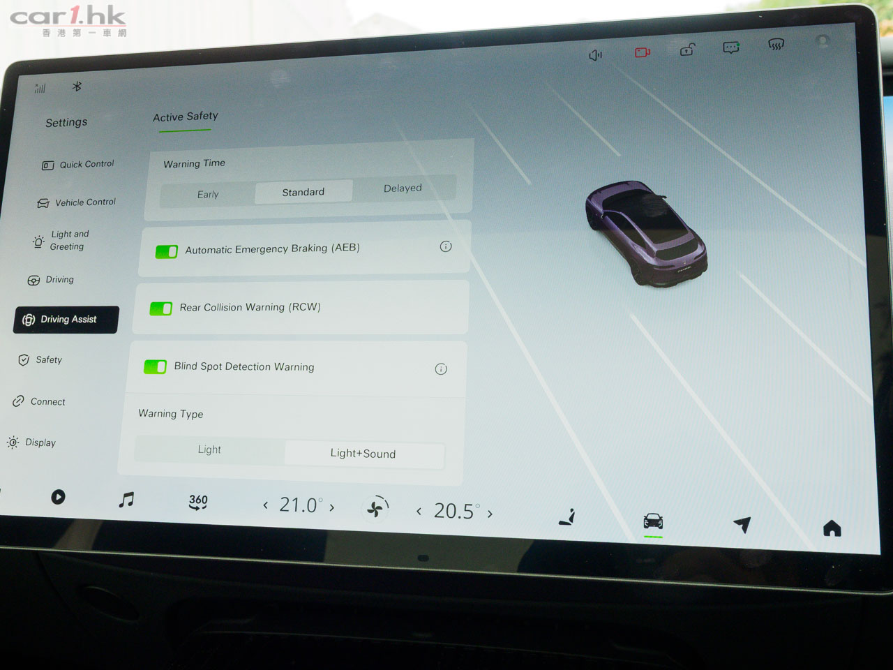 安全系統有前撞預警和自動煞車、前方橫穿障礙預警、後撞預警、沒有轉向輔助的離線警示、開門有車警示、盲點有車警示。