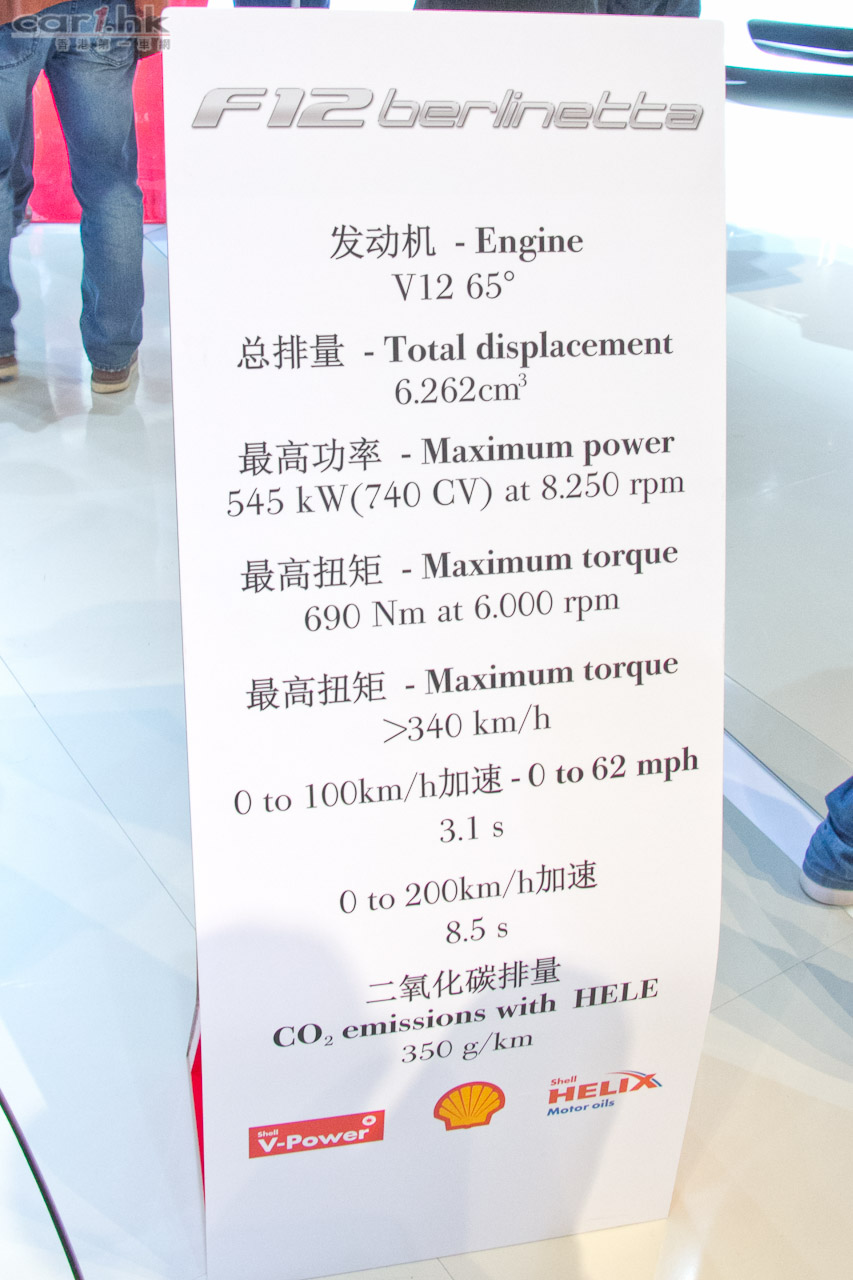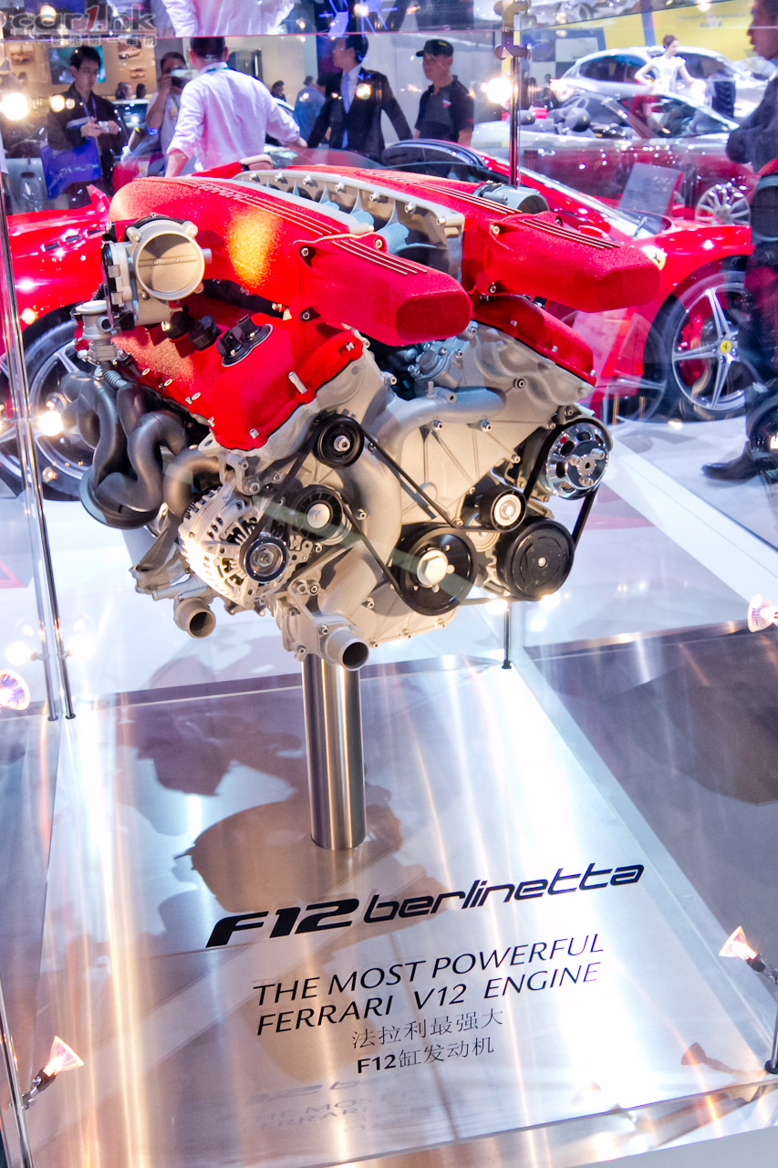 Ferrari F12berlinetta 繼日內瓦車展後,再於北京車展中亮相,作為 Ferrari 史上最強的量產車,F12berlinetta 採用全新的車架底盤和車身外殼, 更把傳統系統革新,擁有更出色的後懸掛系統和變速箱。但重點是採用全新高性能 6,262cc V12 自然吸氣 12 缸引擎,8,250 轉輸出最大馬力 740 匹,以及 6000 轉爆發 690 牛頓米驚人扭力,0-100 km 加速只需 3.1 秒,而 0-200km/h 加速也只需 8.5 秒,極度可達 340km/h。如此驚人的性能,難怪迷到不少強國人士無視保安,親身坐上 Dream Car 慢慢睇慢慢品嚐。