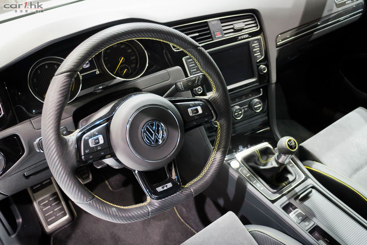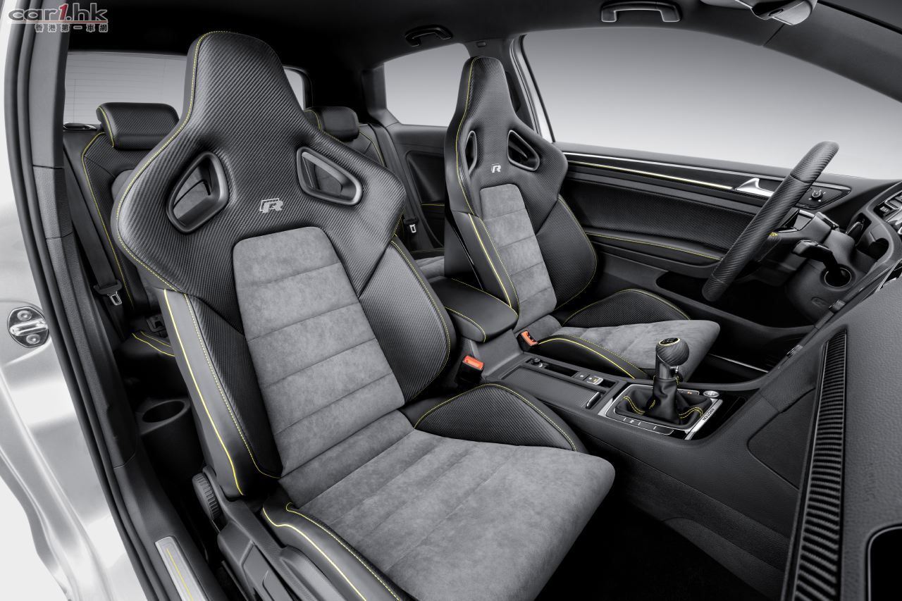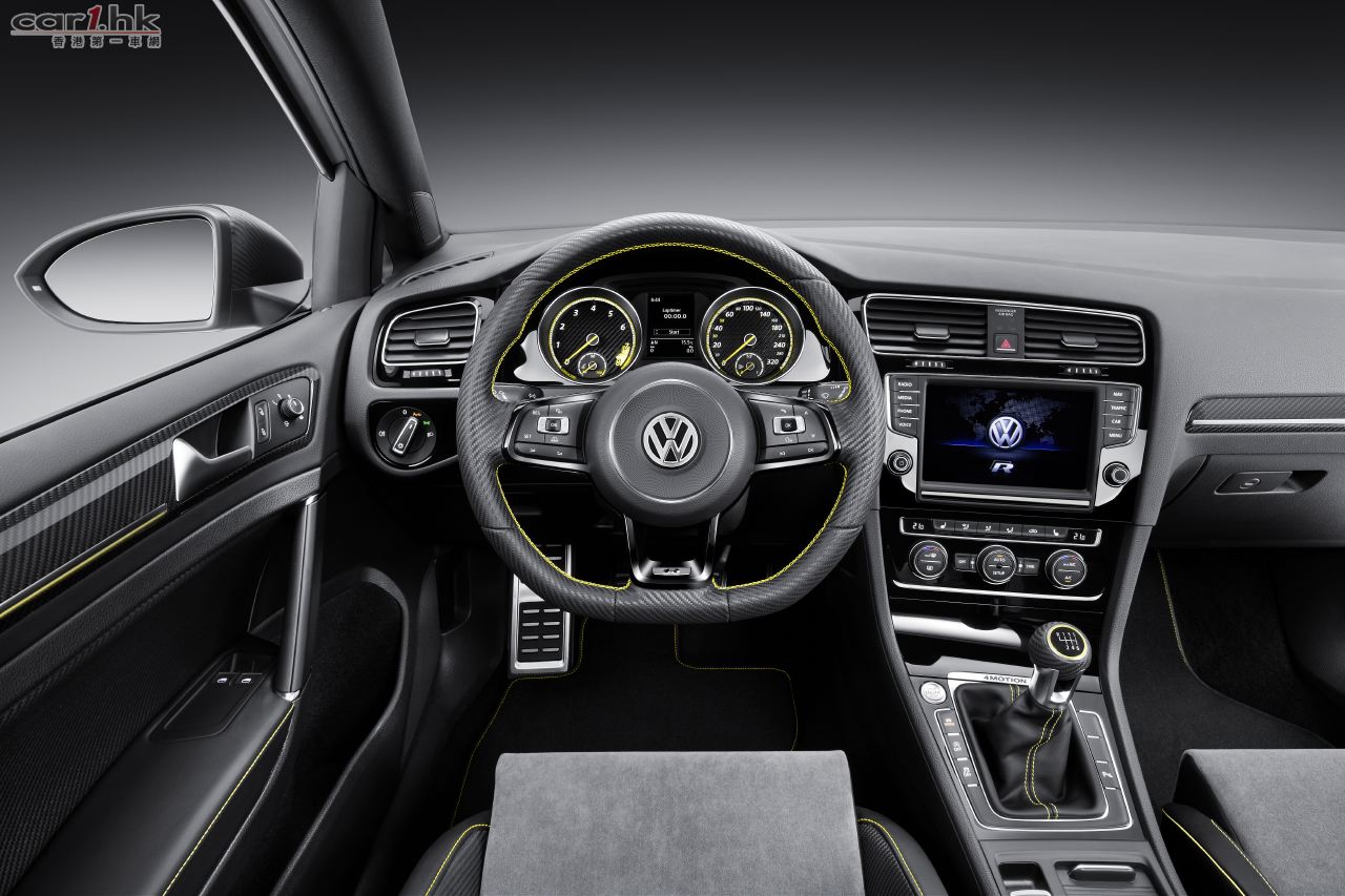 車廂佈局與現有 Golf 相近,不過車廂內黑色作主調,再以黃線作出高反差對比,同時與 R 400 的主題黃色作出內外呼應。前排車椅採用桶式設計,碳纖維真皮作車椅的物料。座姿低,加上桶椅一起,令人感到像坐在賽車中。此外,軚盤還用上碳纖紋理,三幅式平底設計,加上 R 車章和黃線縫合,真是讓人想即時開車試走一轉。錶板的刻度、指針都是黃色,以碳纖托底,不過這套錶板的佈局跟現有的 Golf 未有轉變,中央都是設有 LCD 顯示屏,作多功能顯示。R 400 還裝備了與量產車型相似的 “ESC Sport” 功能。 “ESC Sport” 功能通過位於中控台的兩檔控制按鈕啟動,駕駛員短按一下即可啟動 “ESC Sport” 功能。當車輛在多彎道道路上(如賽道)高速行駛時,ESC 不會頻繁施加干預,從而使 R 400 的操控性更加靈活。看完了官方的資料,真想 Golf R 400 快點可以量產和試駕,相信它的出現將會掀起另一次 Hot Hatch 的風雲戰。