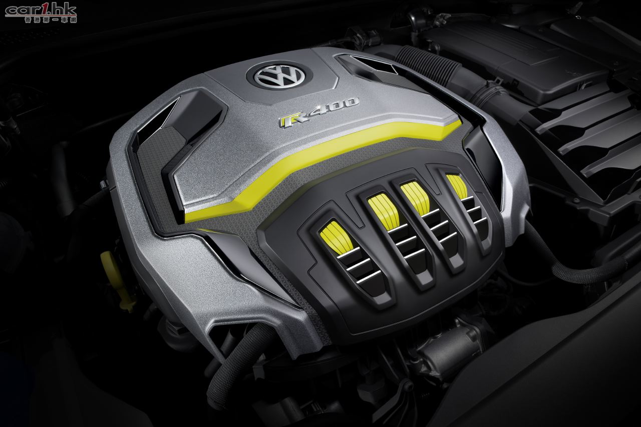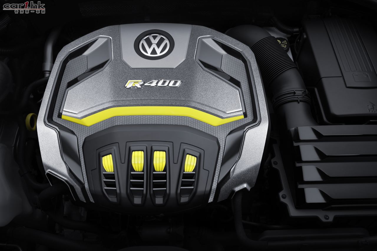 雖然這部 Golf R 400 是概念車,但是它的量產機會很高,最快可能一兩年後就可以面世。Golf R 400 車重只有 1,420kg,採用現有的 2.0 TSI 渦輪增壓直噴引擎和配合 4MOTION 四驅系統,以提供最出色的動力輸出和優良的駕駛風格,展覽館中的示範車配上 6 速手動波箱,不過官方資料指它還有 6 速 DSG 波箱,想獲得更佳的加速表現,6 速 DSG 波箱版本是必需的。在車身多個位置輕量化後,其輸出重量比達到 3.55 馬力/千克,與超跑級相近,所以它的實力不容忽視。