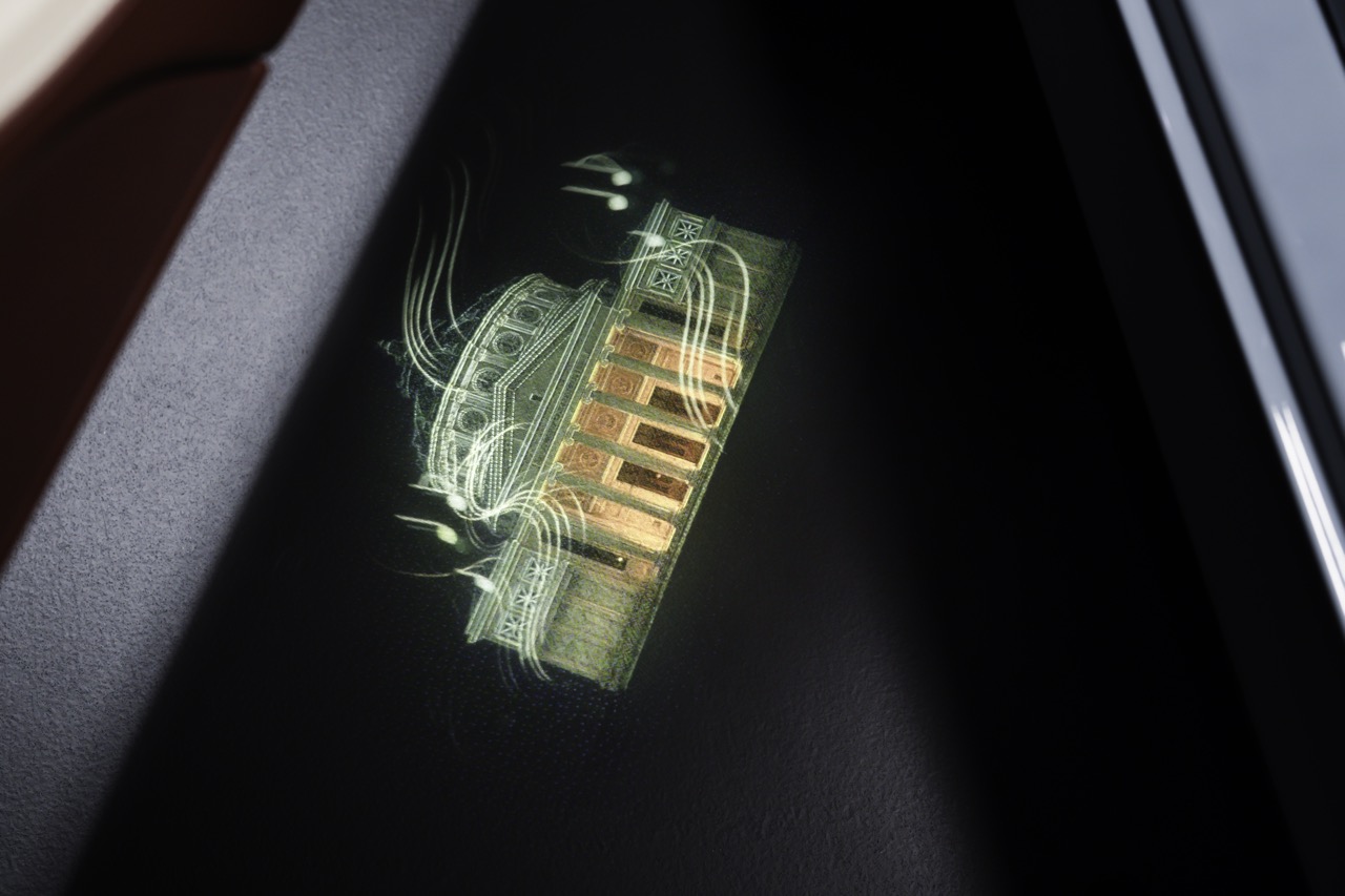 在 Mulliner 最近的一個作品集中,為了向羅馬尼亞雅典娜音樂廳(Romanian Athenaeum Concert Hall)致敬,設計師便將車內儀錶板的音樂元素與頭枕刺繡結合,創造出獨特的迎賓動畫:溫暖的燈光在動畫中心綻放,周圍環繞著躍動的音符,完美呼應了音樂廳的藝術氛圍。這種將實體工藝與數碼動畫相結合的細膩心思,正是 Mulliner 想要傳達的頂級奢華體驗。