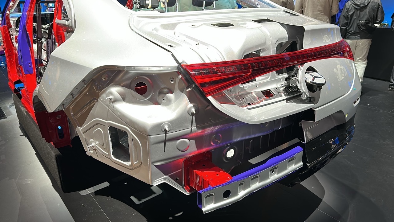 在上海車展前席,Mercedes-Benz 罕有地向傳媒展示旗下 CLA 車型的「剖開解剖版」,以視覺方式解構安全背後的工程奧秘。從這幾張現場拍攝的圖片中可以見到車架內部用色標明不同物料,背後其實是品牌引以為傲的車身強度技術。