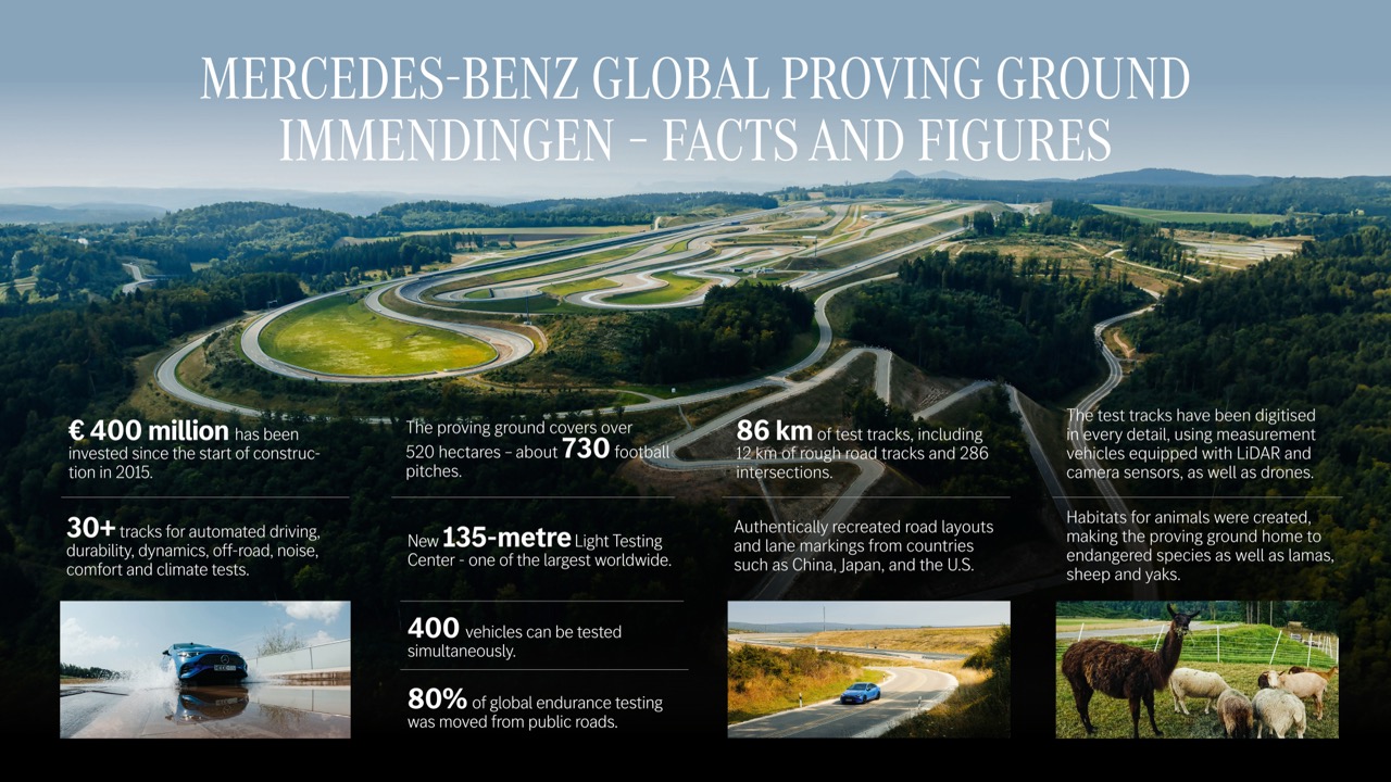 自2013年動工以來,Immendingen測試中心已讓超過30,000部試驗車累積行駛超過1億公里 – 等於環繞地球2,500圈。這裡設有城市模擬區、高山彎路、越野道及可達100%坡度的極限坡路,甚至裝有「人造太陽」照明系統模擬強光反射,讓各式感測器都能在極端光源下測試。