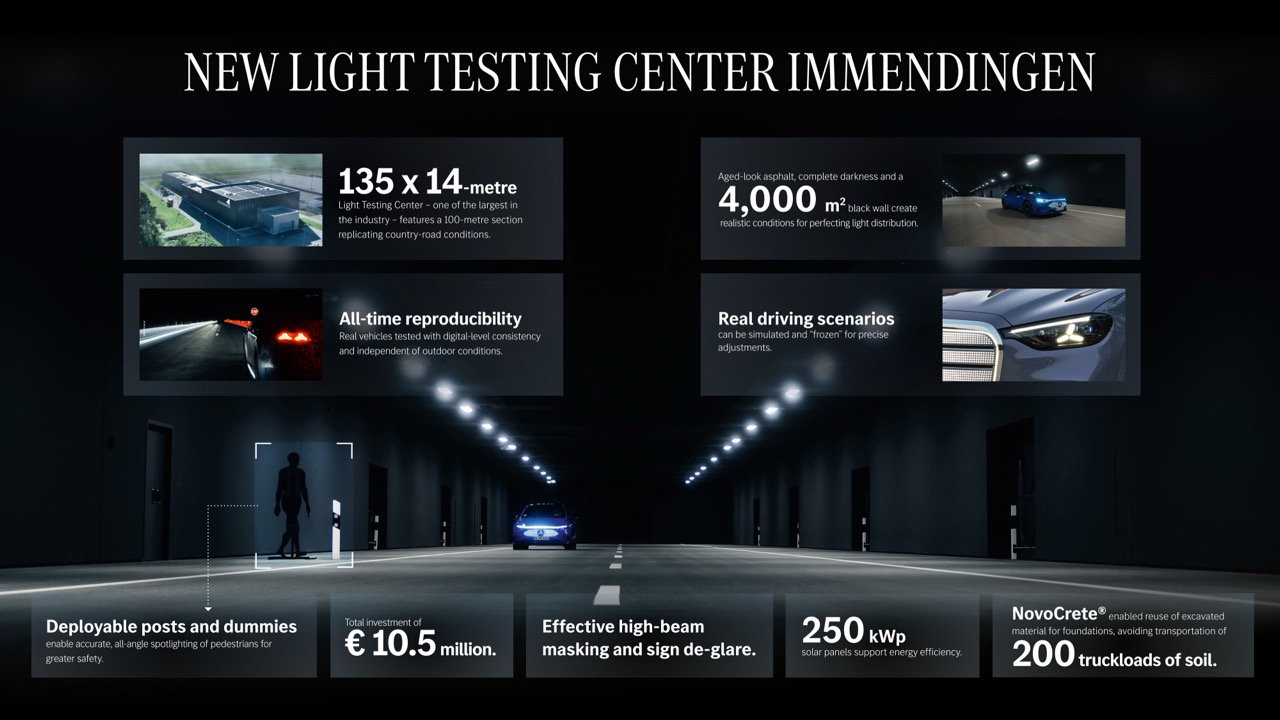 全新燈光測試中心長135米、高8米,內部重現一段逼真的「德國鄉道」,連反光度都模仿老化柏油路的效果,真實度極高。現場最多可同時測試五部車,並可模擬迎面來車、行人與路邊反光柱。這讓工程師可在完全無天氣、時間影響的情況下,精準調校每款車型的頭燈照射距離、智慧遠光切換與自動避閃功能。