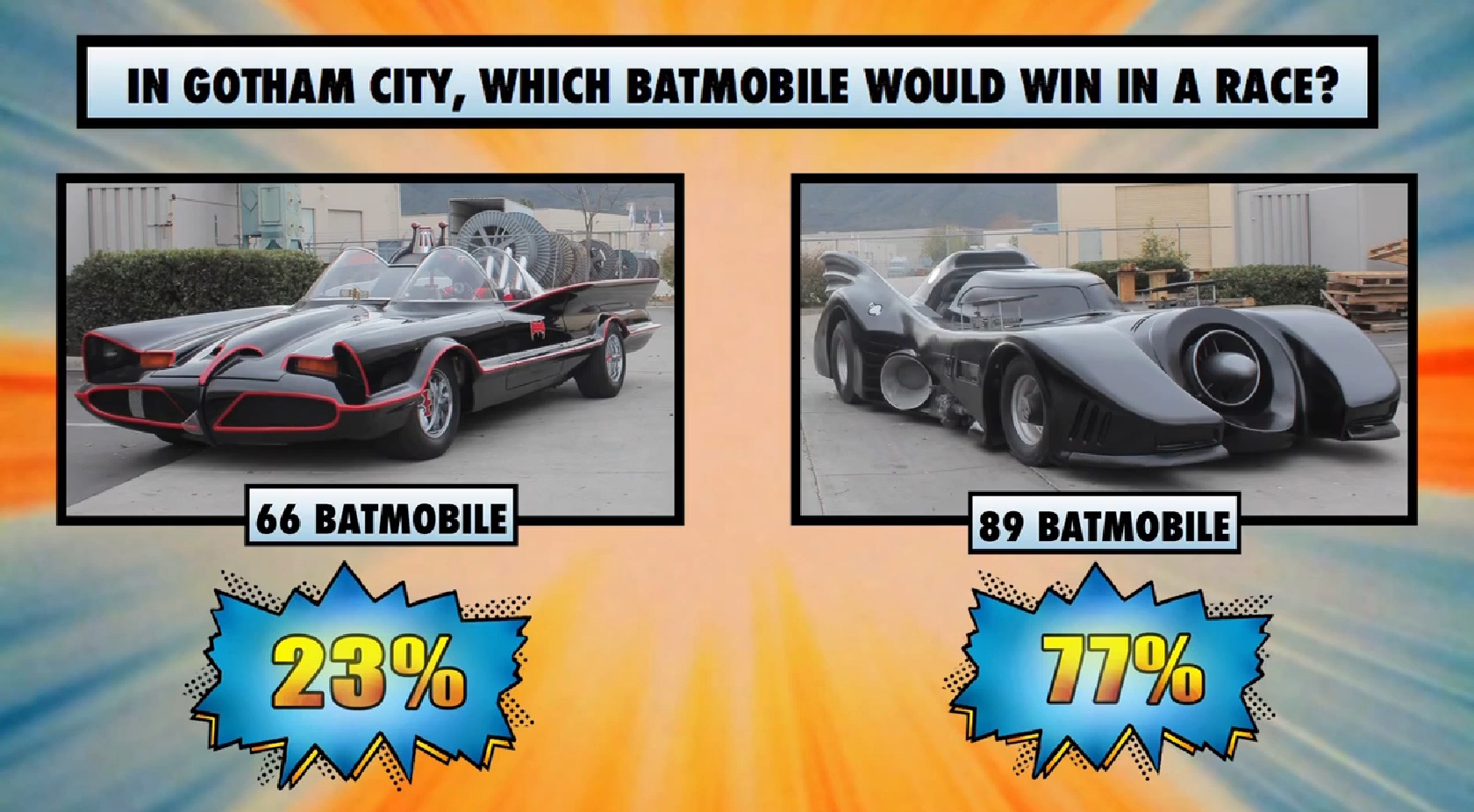 筆者不知道各位腦海第一次浮現「哩架車真喺型到爆」時,究竟是是那一款車子,但對我自已來說就是看到 1989 年蝙蝠俠電影中的主角座駕,當時真的感到很震撼。現在外國傳媒 Super Power Beat Down 重新打造 1966-1968 年電視版與 1989 年電影版蝙蝠車進行直線加速大決戰!1966-1968 年電視版蝙蝠車以 Chevrolet Corvette C4 為基礎, 採用 V8 汽油引擎可輸出最大馬力 325 匹,極速可達 290km/h。