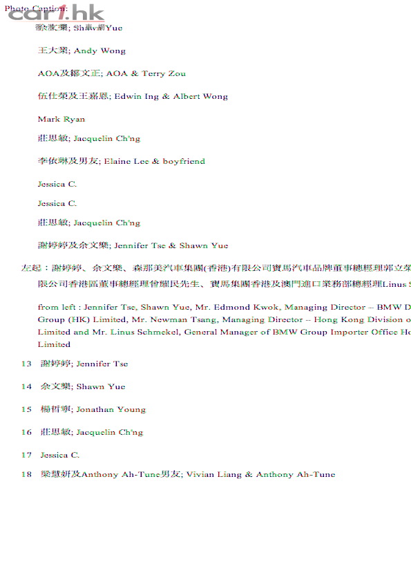 全新 BMW 3 系 Gran Turismo 房跑現已隆重抵港,為隆重其事,寶馬汽車(香港)有限公司假香港會議展覽中心舉行新車揭幕酒會及慶祝派對,展示全新設計GranTurismo獨一無二的動感空間。活動當晚大會邀得演藝界型男美女典範的余文樂先生及謝婷婷小姐聯同寶馬集團香港及澳門進口業務部總經理 Mr. Linus Schmekel, 森 那美汽車集團(香港)有限公司寶馬汽車品牌董事總經理郭立榮先生、寶馬汽車(香港)有限公司香港區董事總經理曾耀民先生主持揭幕及祝酒儀式。慶祝派對上雲集不少影視紅星,當中包括: 莊思敏、Jessica C.、鄒文正、AOA、伍仕榮、王嘉恩、王大業、王敏德、黃柏高 、Mark Ryan、甘國亮、洪永時伉儷及李依琳等。