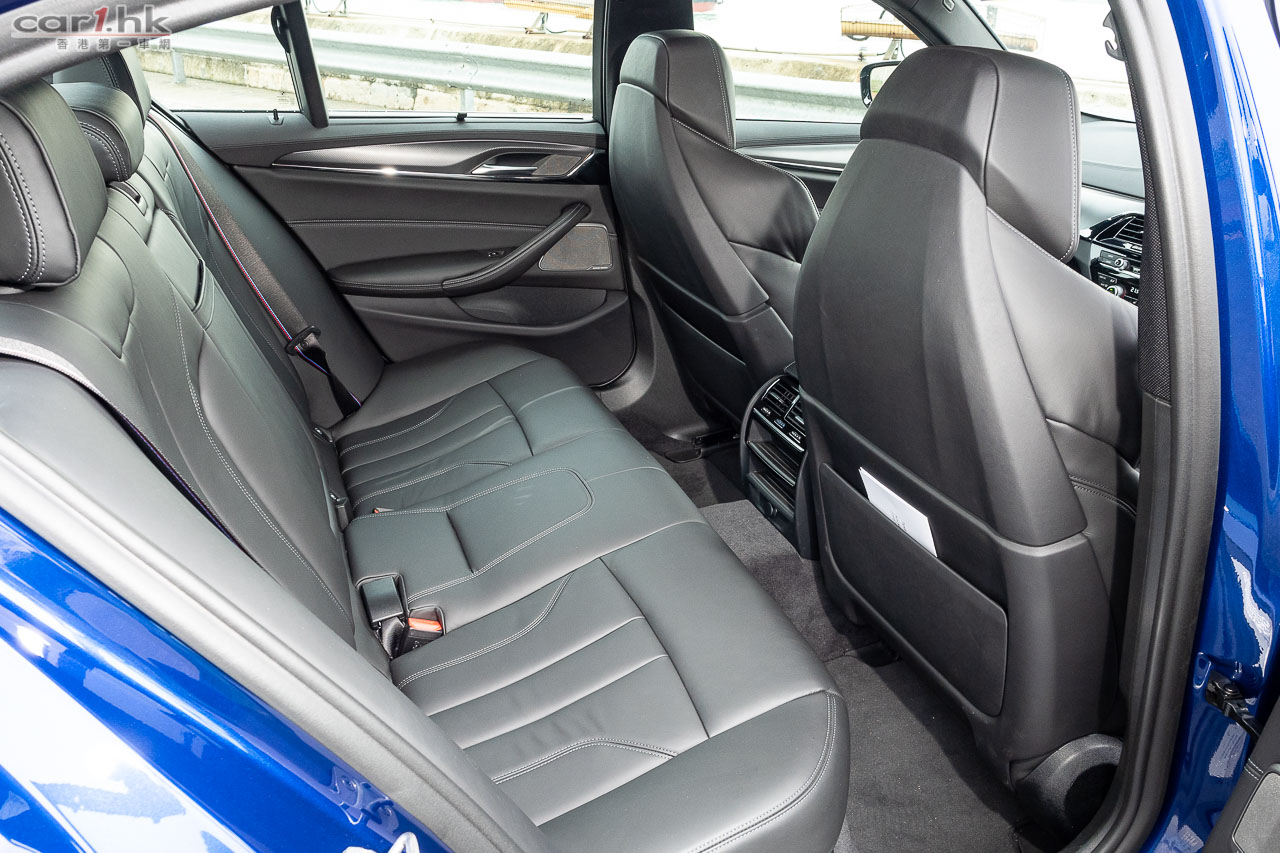 氣氛和裝備貼近 7 系的今代 5 系,隨稍稍比舊款 5 系擴大的車身體積,車廂空間也有增長;中控台 10.25 吋屏幕系統採用與 7 系一樣的「6 大方格、兩大主頁」介面和圖案設計,以及可透過輕觸式「督…督…督…」、iDrive Controller 轉盤、Gesture Control 手勢控制和 Voice Commands 語音控制來操作,可識別英、德、中、法、意、葡、日和西班牙文,M5 當然一樣。轉線時盲點有車警示兼自動扭軚的 Lane Change Warning、車道偏離警示 Lane Departure Warning、路口有車警示 Crossing Traffic Warning、緊急制動系統 Emergency Braking 等安全系統沒有分別。原廠屬選項、香港代理作標準裝置的 Ambient Lighting 氣氛燈光,同有 6 種顏色和 11 種光效組合選擇。M5 特有像盔甲般的連頭枕前座,「M」款軚盤除控制音量和巡航系統的按鈕外,另有兩粒紅色「M 1」、「M2」制可記下兩個司機的不同懸掛、波箱、引擎、軚盤、四驅反應和HUD投射儀錶的設定。新設計的「M」款波棍,將「Drivelogic」轉波快慢制放了在其頂部(以往 M 車的波箱快慢制放在波棍外)。有不同圖案的數碼儀錶,只有黑底/白字/紅針一個模樣,不似普通5系會隨Eco、Comfort和Sport駕駛模式而變出藍、白、紅色顯示,儀錶頂部有三格圖案顯示引擎、懸掛、軚盤的 Comfort、Sport 和 Sport + 設定。