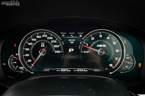 M5 有不同圖案的數碼儀錶,只有黑底/白字/紅針一個模樣,不似普通5系會隨Eco、Comfort和Sport駕駛模式而變出藍、白、紅色顯示。