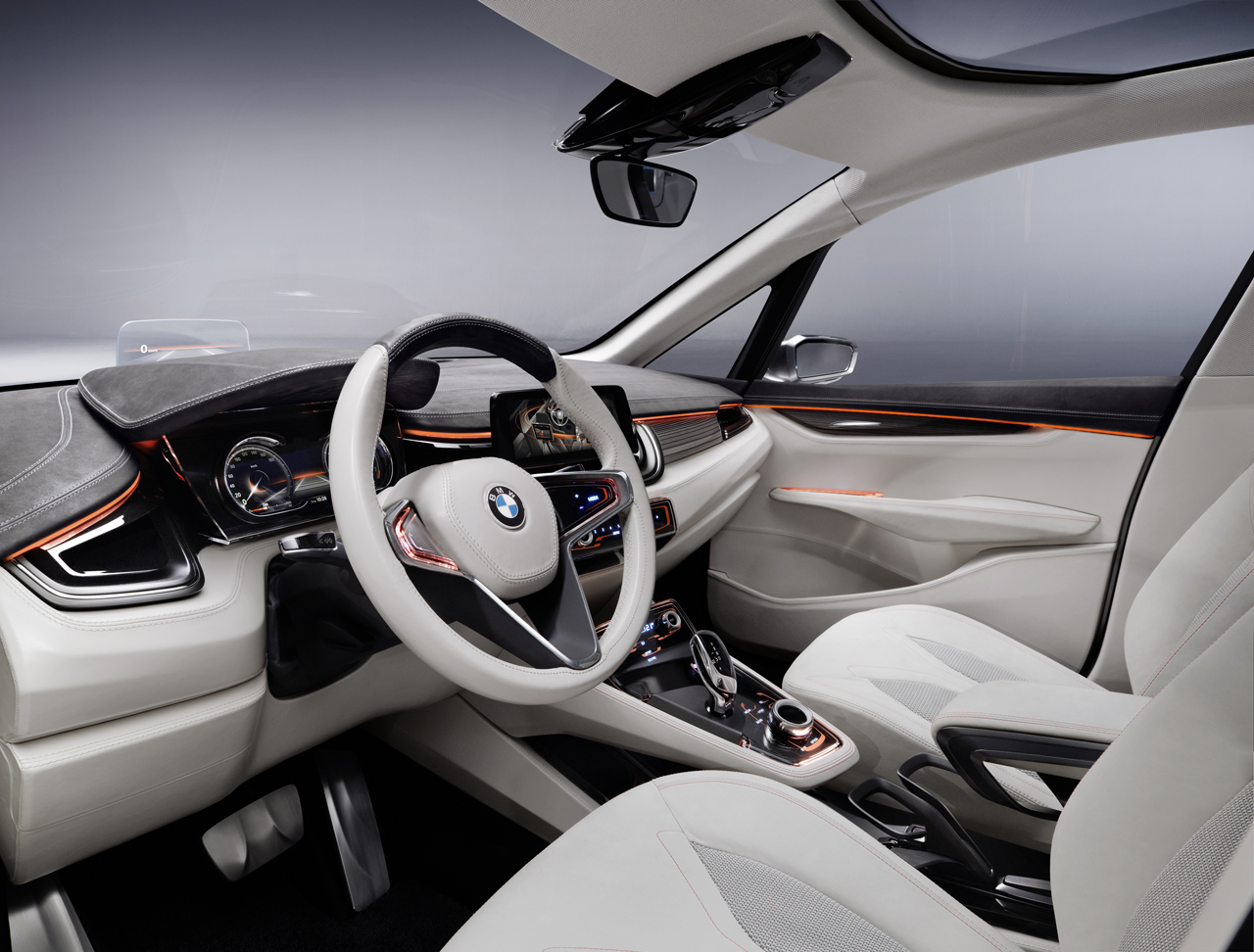 儀錶板與擋風玻璃之間設有 Head-up Display(HUD),顯示所需行車資料,感覺更高科技之餘亦實用。中控台的多功能顯示屏達 10.25 吋闊,幾乎與一部平板電腦無異,配合廠方自家研發的 ConnectedDrive 系統,一併操作行車設定及多媒體播放最為合適。有趣的是 BMW 亦深明現在不少人已備有平板電腦,因此亦在 Concept Active Tourer 預留專用夾,讓駕駛者自行決定是否一併採用手上的平板電腦。