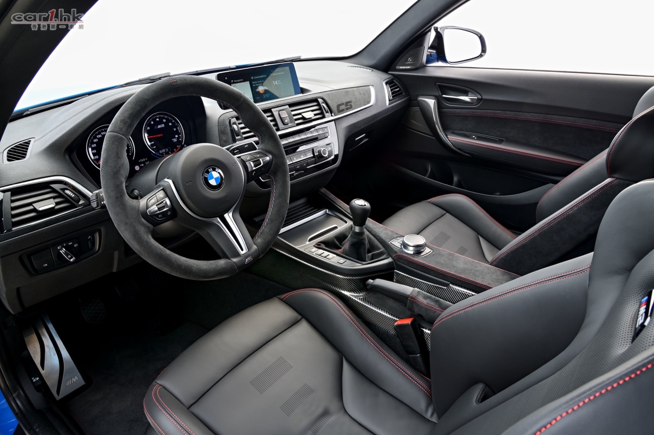 BMW M2 CS 的車廂設計亦充份體現競賽元素,低重心設計及主動式M懸掛系統讓卓越操控時刻唾手可得。人體工學設計同時兼顧日常使用需要和賽道操控本色,在黑色Alcantara搭配BMW individual Merino頂級真皮組合成賽車桶型座椅,於各種速度與急彎的情況下為駕駛者提供足夠完整支撐,過彎時完美包覆兩側腰部及肩部。同樣以黑色 Alcantara麂皮包覆M 專屬跑車軚盤,增加握感同時帶來無法逾越競賽駕駛體驗。除此之外,座椅配上M系列安全帶及刻有 M2 CS 標記的飾板點綴車廂,讓BMW M2 CS無論是專業賽道或是繁忙鬧市,展現不朽賽車風采。