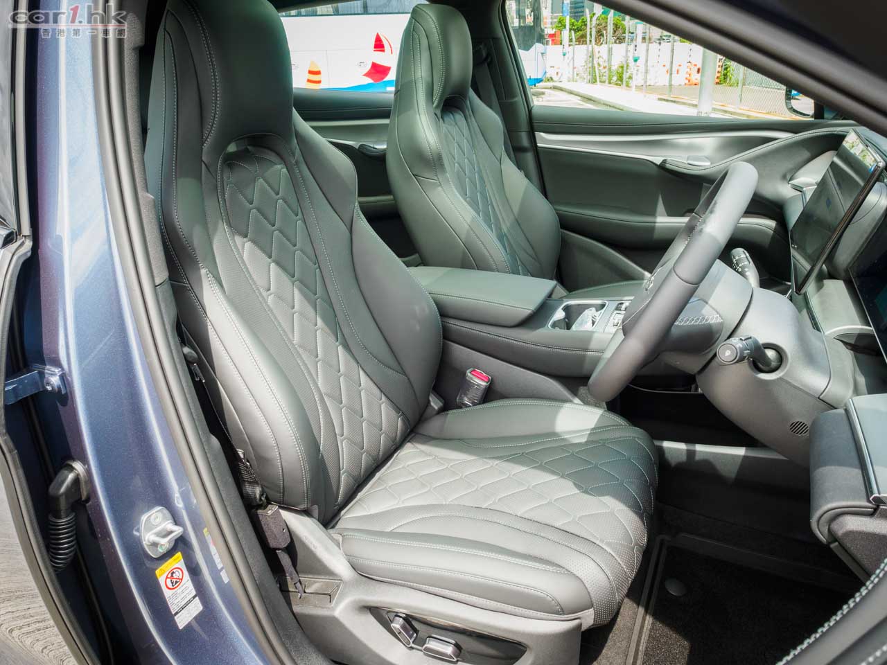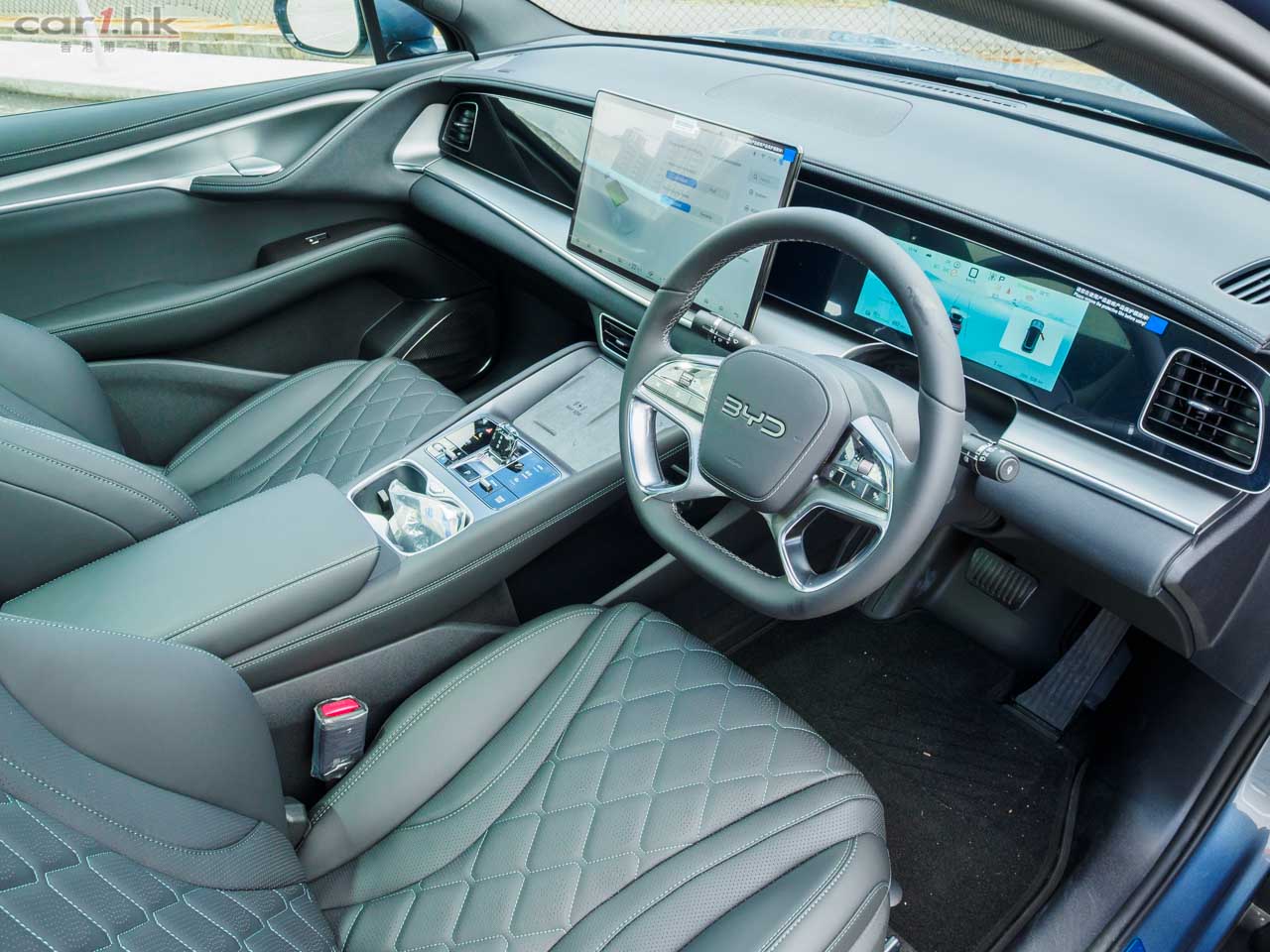 稱為「懸浮之翼」的橫台形錶板伸至門邊位置有像越野車給人扶實的手挽,有一大片亮黑色飾片的錶台有時興的一大一細屏幕,儀錶正中有「車仔」顯示四周的車輛和行人,左邊可顯示胎壓、耗電量,右邊可顯示音樂、導航、加速計時。飛拱形的中橋,下層有載物格,上層有手機充電座和有點像 Volvo 的透明膠波棍頭,「R、N、D」波有亮燈顯示。連頭枕的前座椅較似打機櫈,例牌平地台的後排,中橋有冷氣出口和充電插頭。中台屏幕與其他比亞迪一樣可電動旋轉,不過 16:9 的它打棟看怪怪的,還是打橫比較自然,它可找到駕駛反應選擇,有 Eco、Normal、Sport 和 Snow 踩電反應、兩種回充拖慢度、兩種軚盤重量、兩種 Brake 踏重量,另有 Comfort Braking 停車減「chok」、HDC 落坡慢爬,除了電門反應在波棍台有制可撳外,其他功能都要從屏幕找出來。車子不似 Seal 和 Sealion 的 Performance 版有「雲輦-C 智能懸掛」即電子控制自適應吸震器,所以沒有懸掛軟硬玩。沒有了司機注意力警示的「ADAS」安全和輔助系統,仍有前 / 後自動煞車、前後橫向有車警示和自動煞車、盲點和開門有車提示、偏航警示和扭軚輔助、自動高燈切換、自動跟車巡航系統、360 度泊車鏡頭。有約 228 匹輸出的這部 Sealion 7,0-100 km/h 加速需 7.3 秒(Premium 和 Performance 要 6.7 和 4.5 秒),有踩電易去但其實不是很快的加速感,行車感覺就是所有電車的舒適和寧靜。
