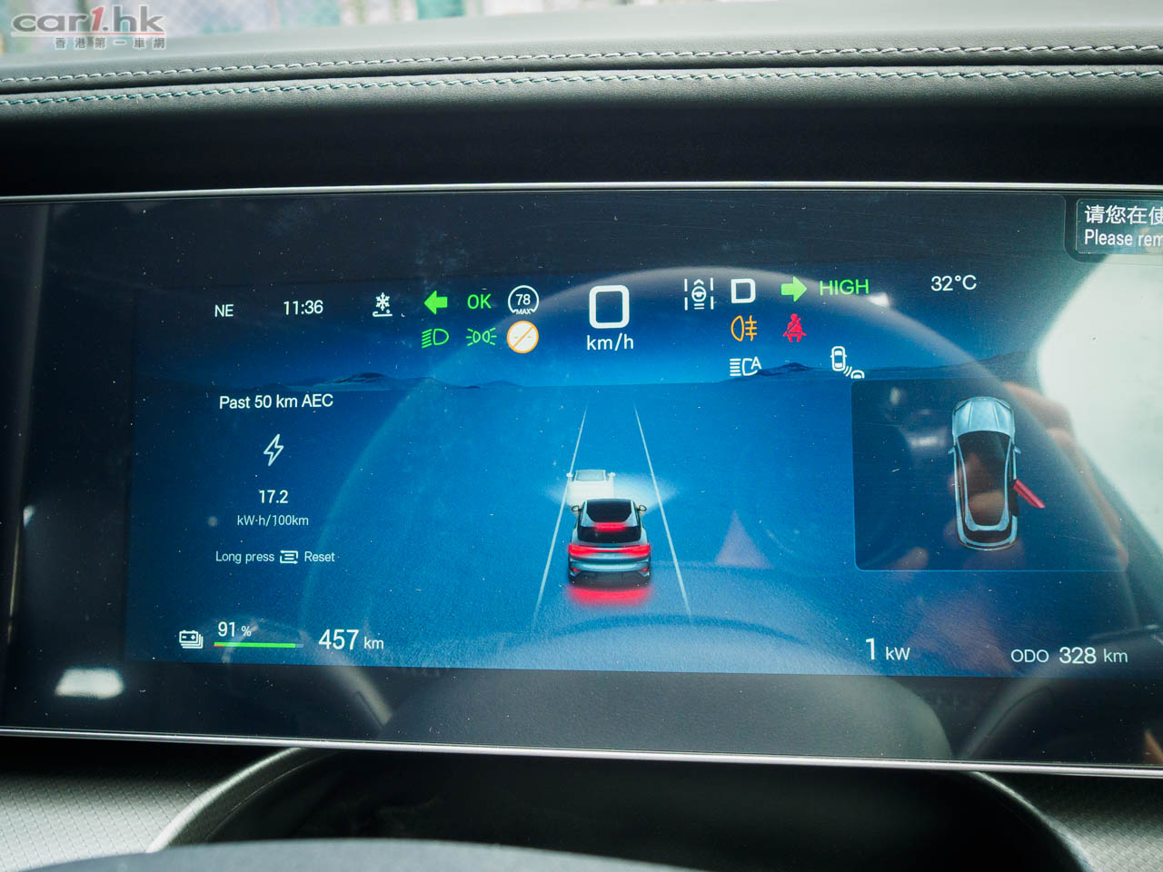 儀錶正中有「車仔」顯示四周的車輛和行人,左邊可顯示胎壓、耗電量,右邊可顯示音樂、導航、加速計時。