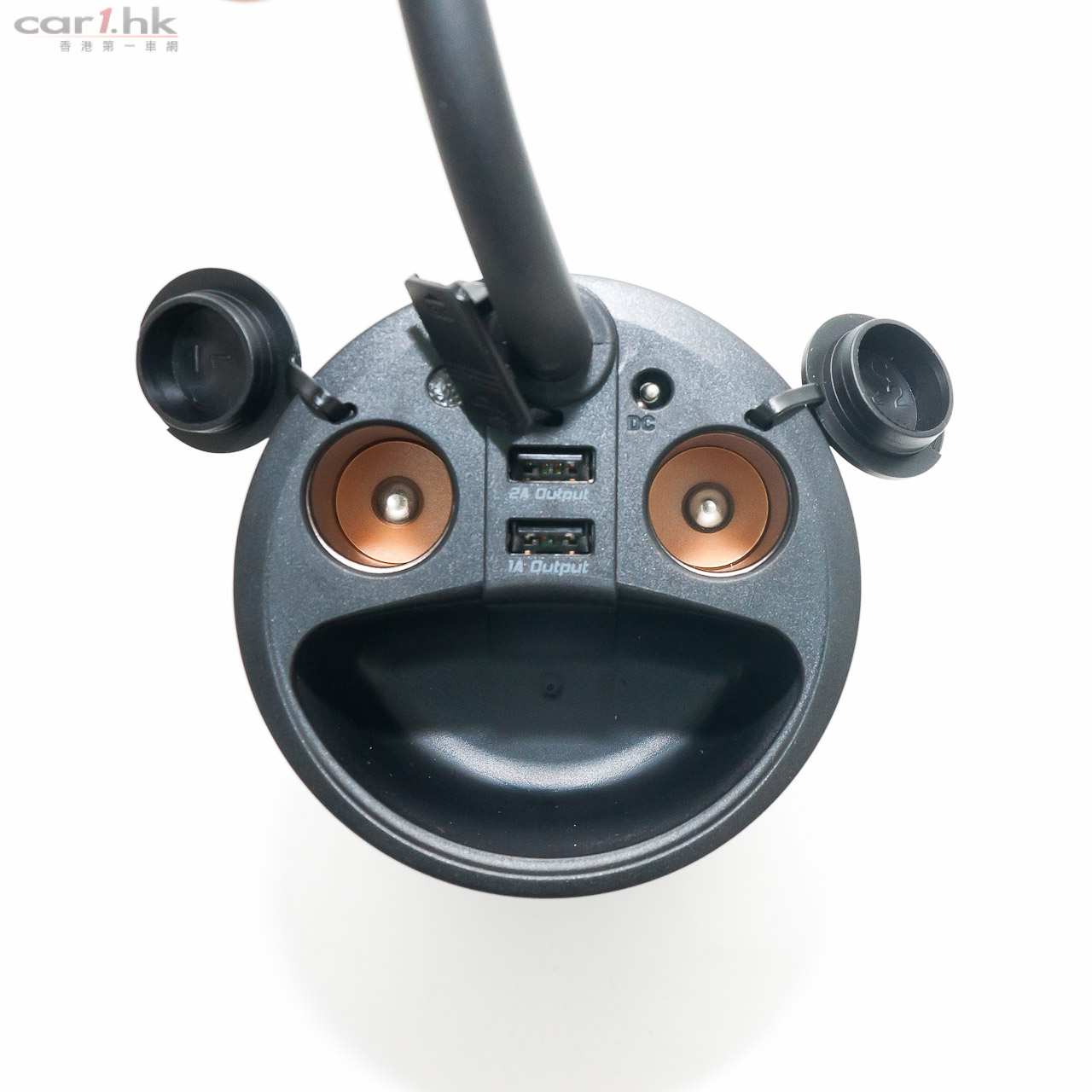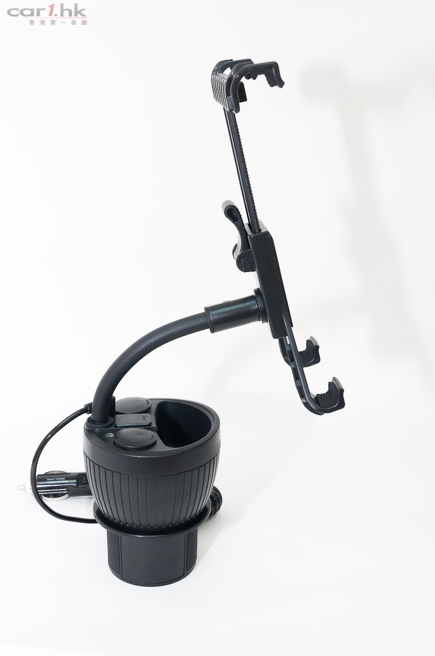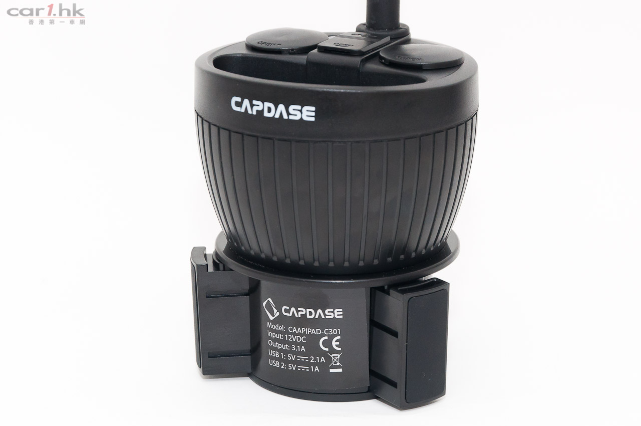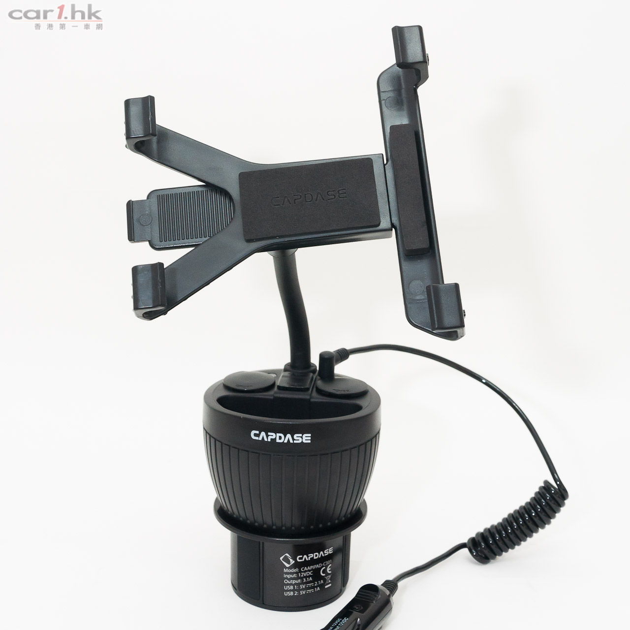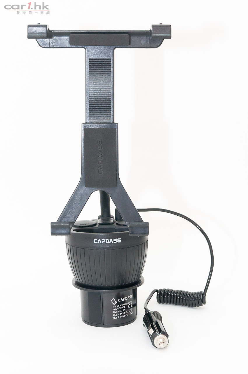 Capdase Car Charger Cup Holder Power Cup 2.2 充電器擁有 2A 和 1A 的 USB 和兩個點煙器,它同時付有一個平板電腦支架。此充電器可以同時替 iPad、iPhone、iPod 或不同型號的手機充電。充電座底部可以轉動調較鬆緊,方便配合不同類型的汽車。充電座上亦預留一個電話座,用家可以把充電中的電話放入。