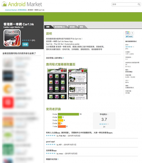 Google Android 版本:https://market.android.com/search?q=car1.hk&so=1&c=apps