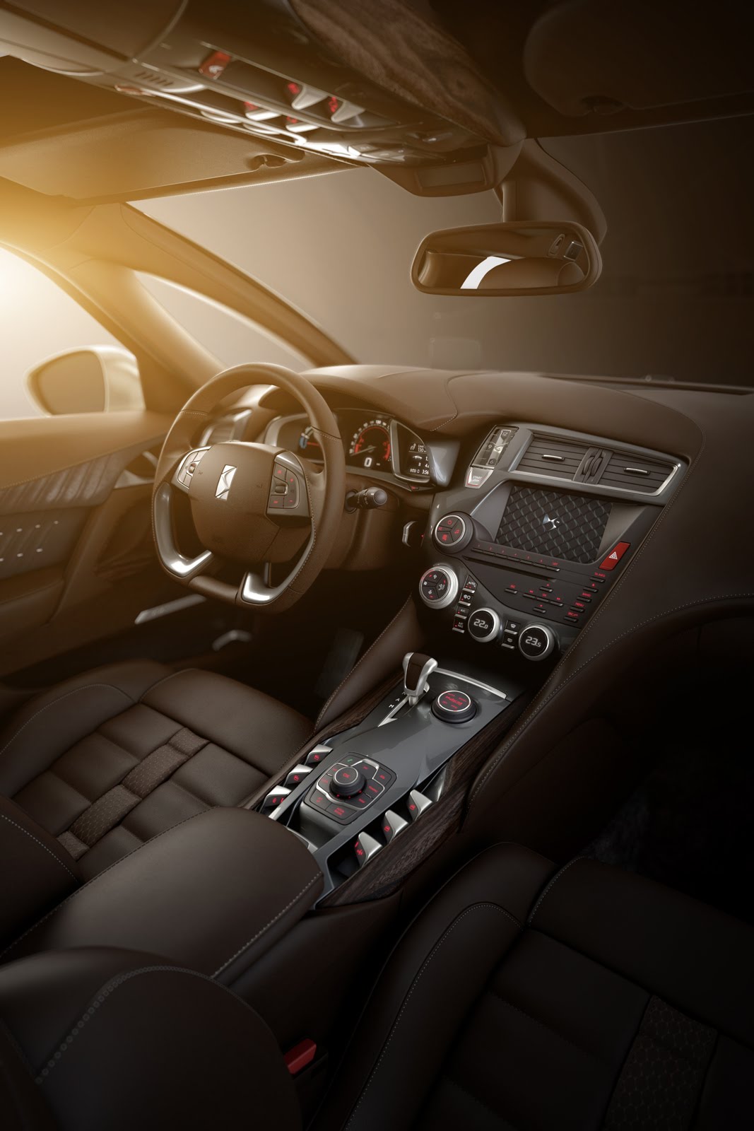 車廂內的中控台原則上與時下的房車差不多,但有趣的是 DS5 罕見地在車頂中間另設一個控制區,並於駕駛者的前方,採用類似電視遊戲裡面的 HUD(Head-up Display)顯示資訊,讓駕駛者有一份操作飛機的感覺。