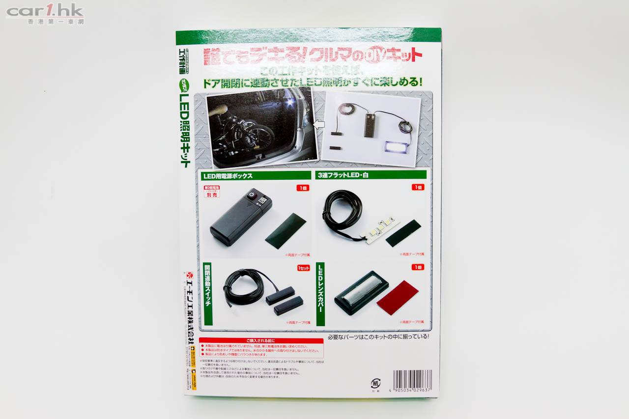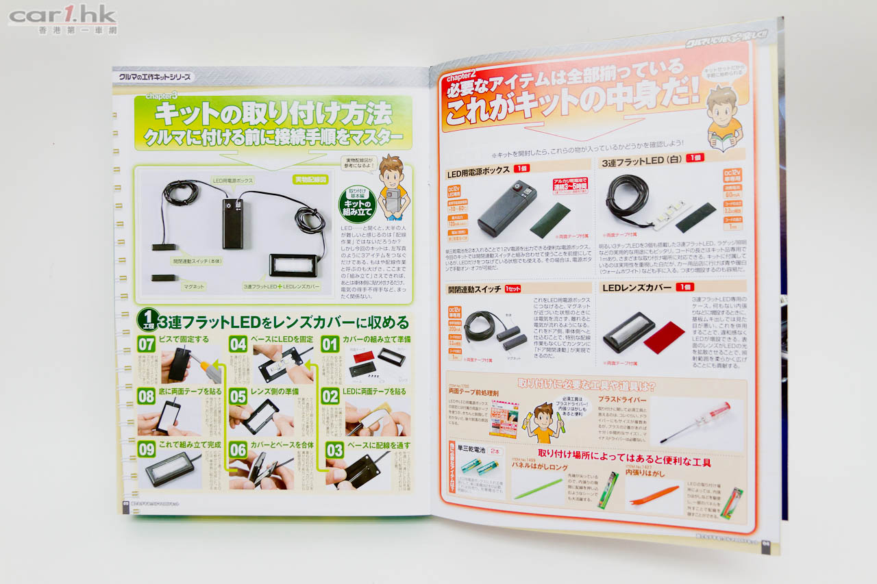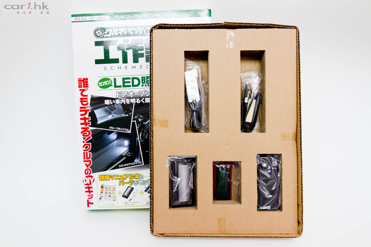 今次介紹的是後加車廂 LED 照明燈組,附有自動開關的功能。這產品可以安裝在乘客位前的小櫃桶、門邊腳踏、尾箱或其他你需要的地方。因為有自動開關模組的關係,所以可以做到打開櫃門燈光就會自動亮起的效果,實在是非常方便。想安裝的朋友不用擔心 DIY 是一件很煩的事,因為「工作計劃」最好的地方就是他們已經準備好所需的配件,而且加上一本設計得像雜誌一樣的圖文並茂說明書,令到整件事變得十分輕鬆。